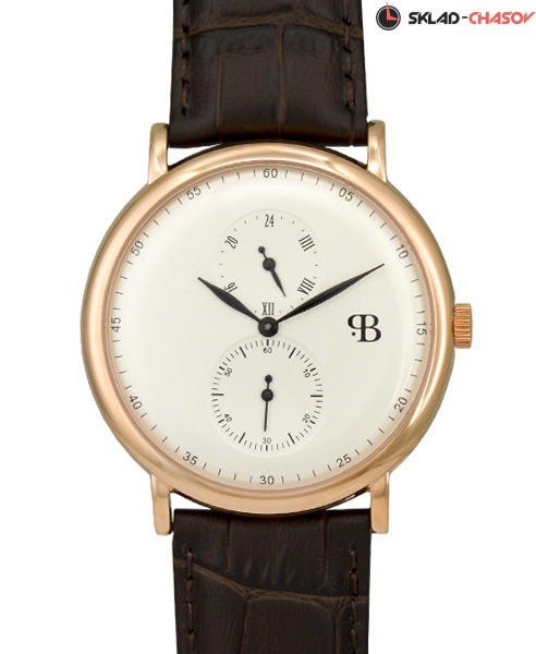 Круглый корпус изготовлен из нержавеющей стали высокого качества и имеет покрытие цвета розового золота. Минеральное стекло надежно защищает циферблат, не искажает изображения. На белом поле циферблата имеется две стрелки – минутная и часовая. Дополнительно модель оснащена выносной секундной стрелкой и двадцатичетырехчасовой шкалой. За точность хода отвечает японский кварцевый механизм фирмы Seiko.