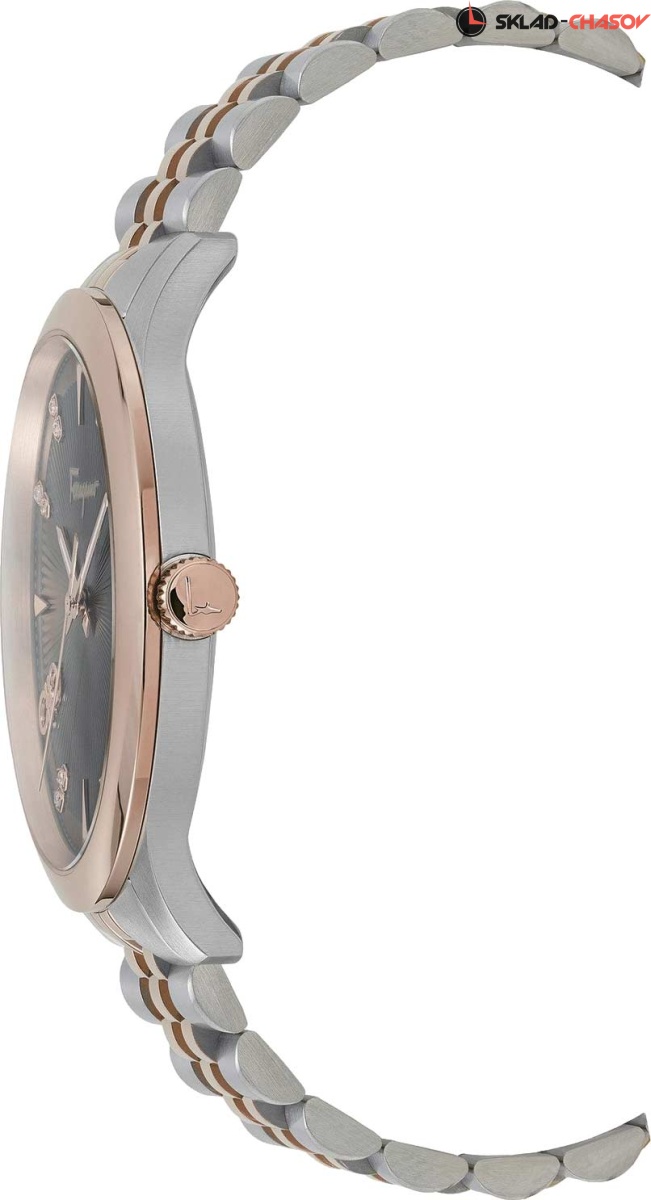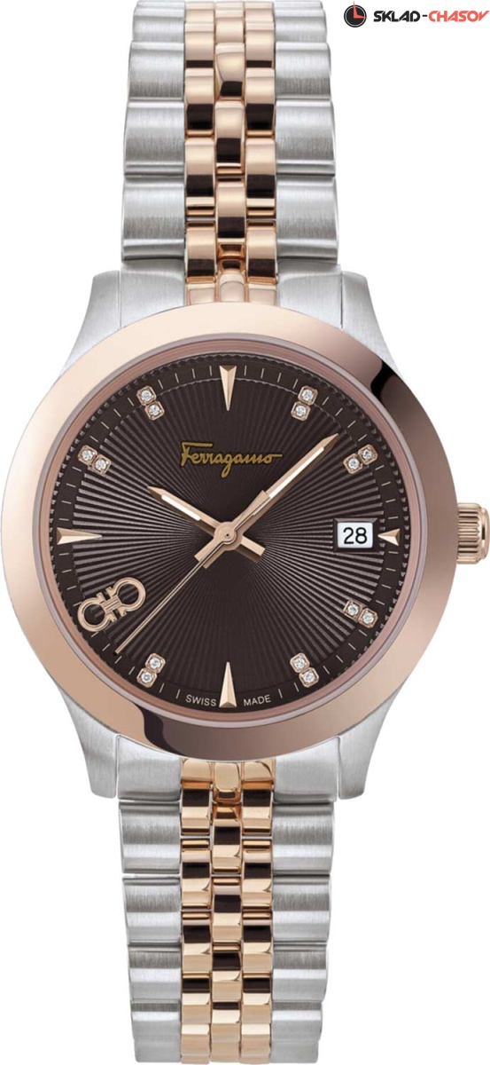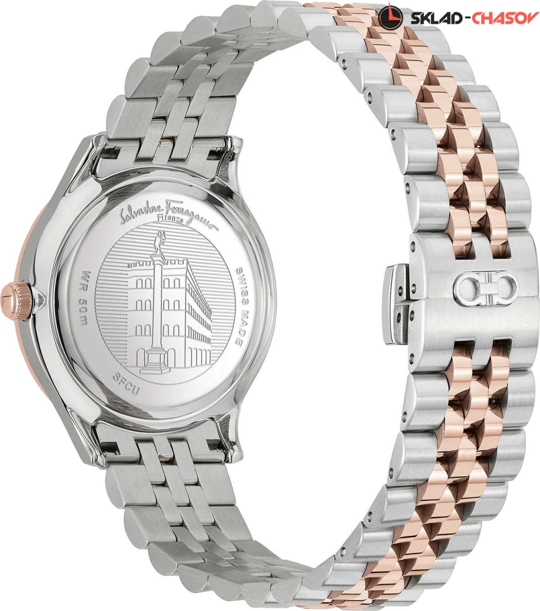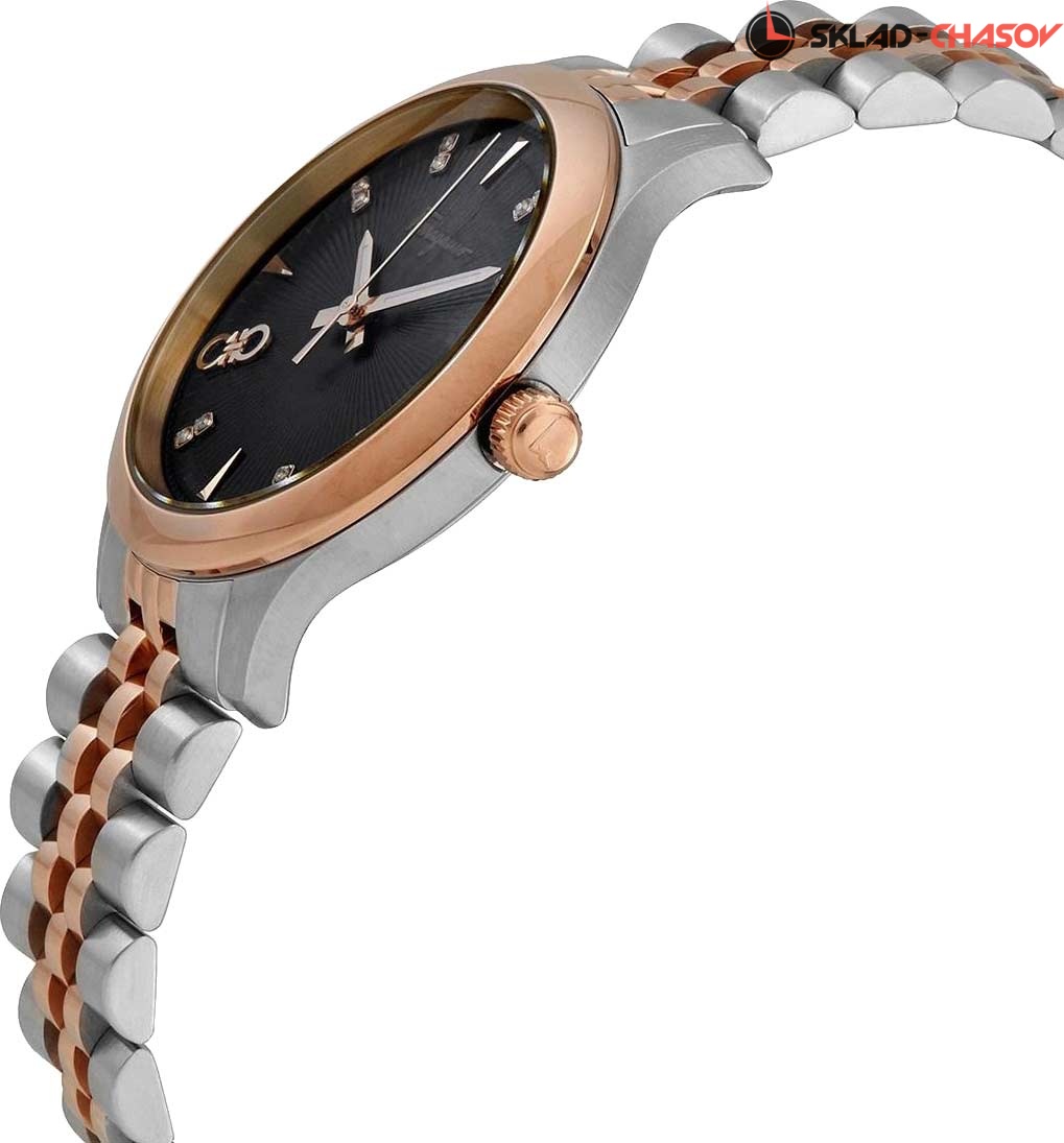 Строгий элегантный дизайн, блеск бриллиантов и отличное швейцарское качество - это то, что необходимо для привлекательной и внимательной к деталям женщине. Duo. Женские часы с круглым корпусом. Метки в виде штрихов. Окошко даты находится в положении 3 часа. Рифленая заводная головка. Задняя крышка украшена выгравированным изображением дворца Palazzo Spini Ferroni. Браслет с раскладывающейся застежкой.