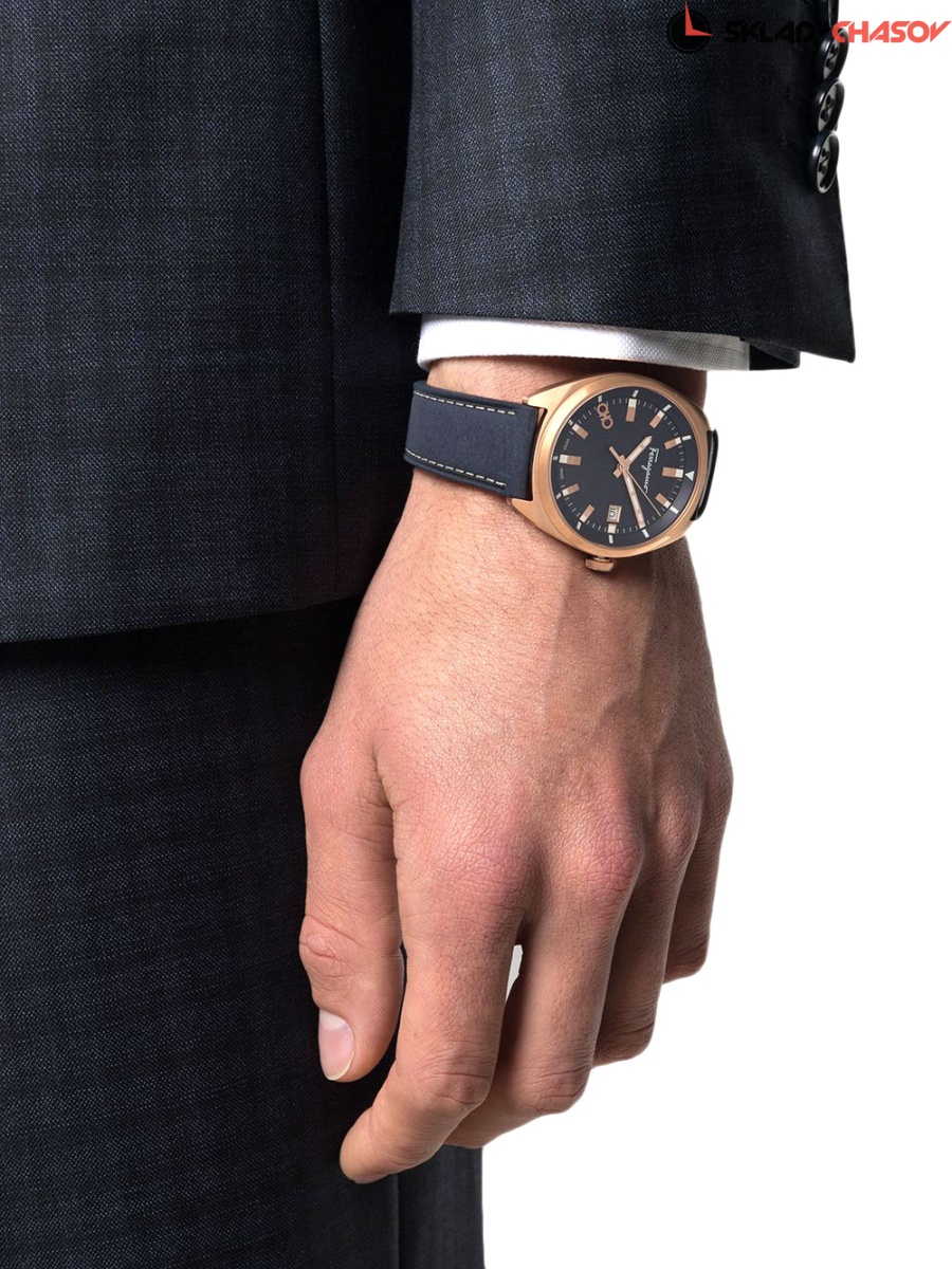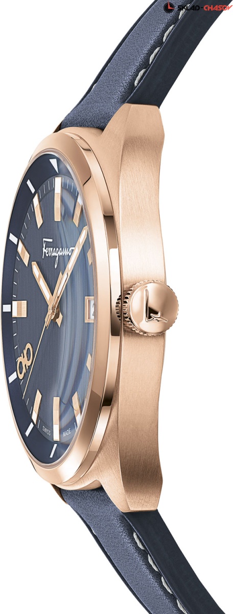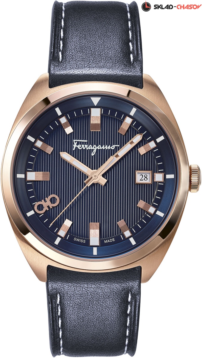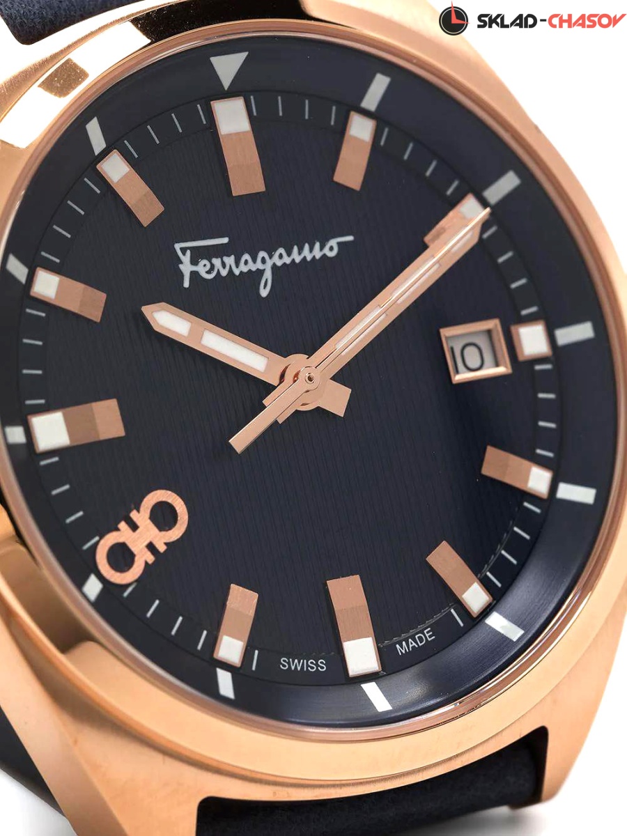 Современный дизайн, классические линии и отличное швейцарское качество - это то, что необходимо внимательному к деталям мужчине. Ferragamo Evolution 40 mm. Круглый брашированный корпус с полированным безелем изготовлен из нержавеющей стали. Циферблат украшен декоративным узором в виде вертикальных рельефных линий. Заостренные прямоугольные стрелки и метки с нанесенным люминесцентным составом, который светится в темноте. Метки в виде штрихов, 8-ми часовая метка в виде логотипа бренда. Окошко даты находится в положении 3 часа. Рифленая заводная головка. Ремешок из натуральной кожи с раскладывающейся застежкой.