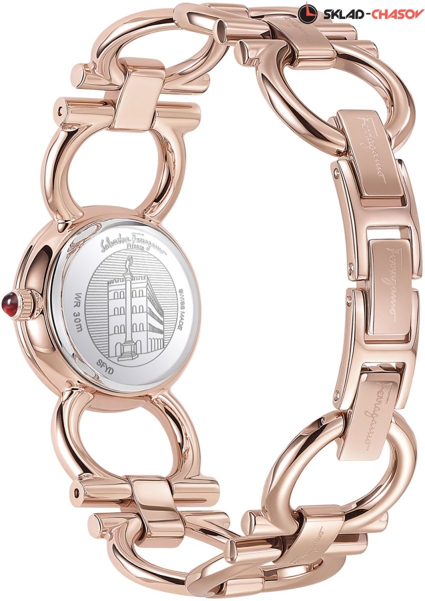 Чувственные, элегантные и эффектные часы с изысканными элементами будут роскошно смотреться на запястье. Double Gancini Round. Часы-браслет. Циферблат, выполненный по технологии Sunray (солнечные лучи), соединительные звенья браслета и застежки украшены фирменным логотипом Ferragamo. Метки в виде точек. Закругленные прямоугольные стрелки. Рифленая заводная головка украшена камнем в форме кабошона. Ювелирная застежка.