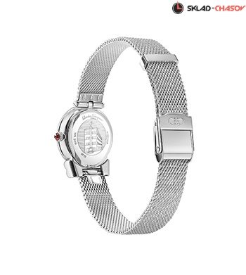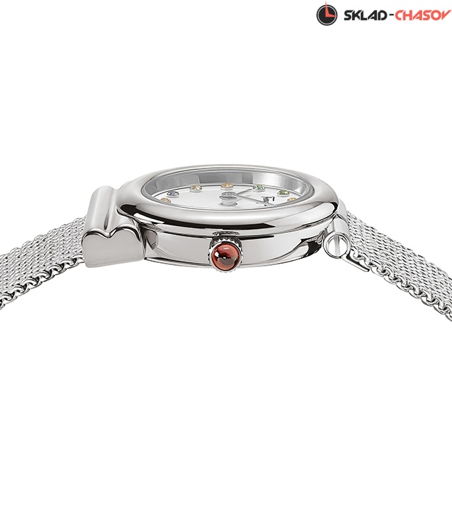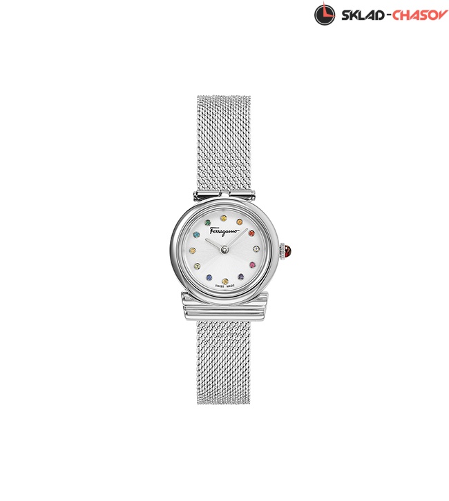 Миланский ремешок шириной 12 мм придает часам свежий современный, но изысканный вид Salvatore Ferragamo Gancini Круглый стальной корпус. На изысканном белом циферблате 12 разноцветных натуральных топазов в качестве индексов.