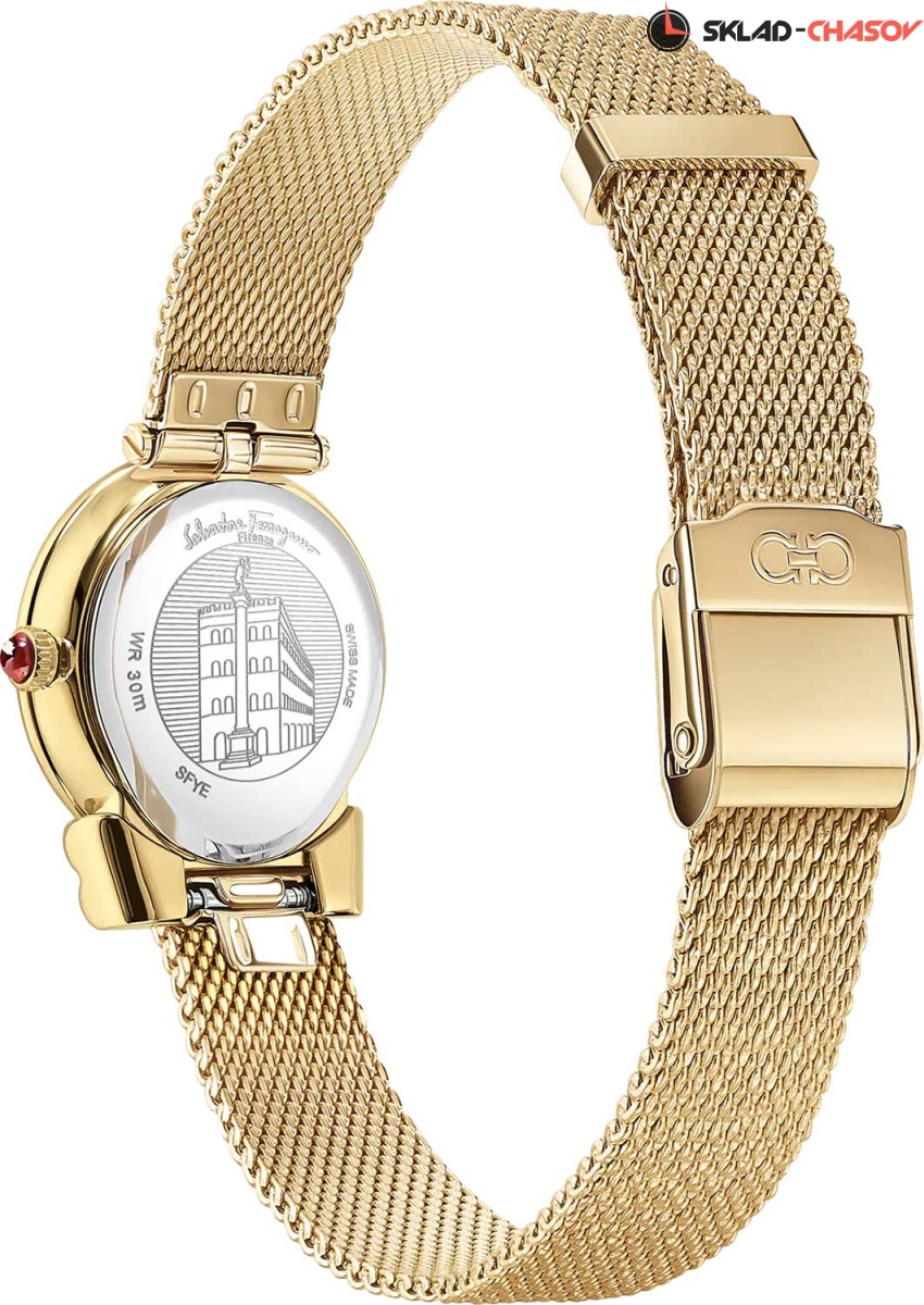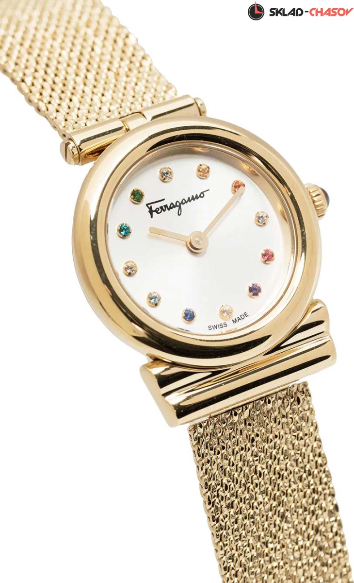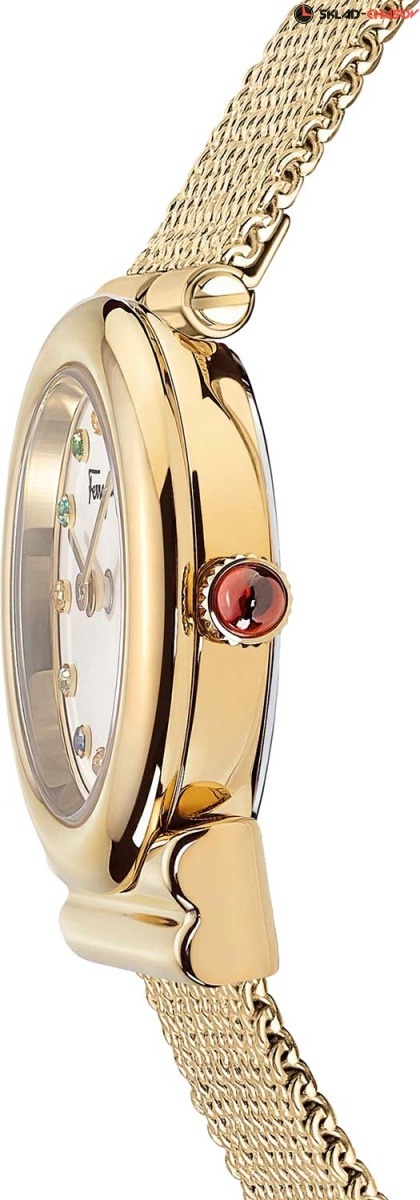 Элегантные и стильные часы с изысканными элементами будут роскошно смотреться на вашем запястье. Gancini. Женские часы с круглым стальным корпусом. Циферблат выполнен по технологии Sunray (солнечные лучи). 12 разноцветных натуральных топазов в качестве индексов. Задняя крышка украшена выгравированным изображением дворца Palazzo Spini Ferroni. Заводная головка украшена камнем в форме кабошона. Браслет миланского плетения.