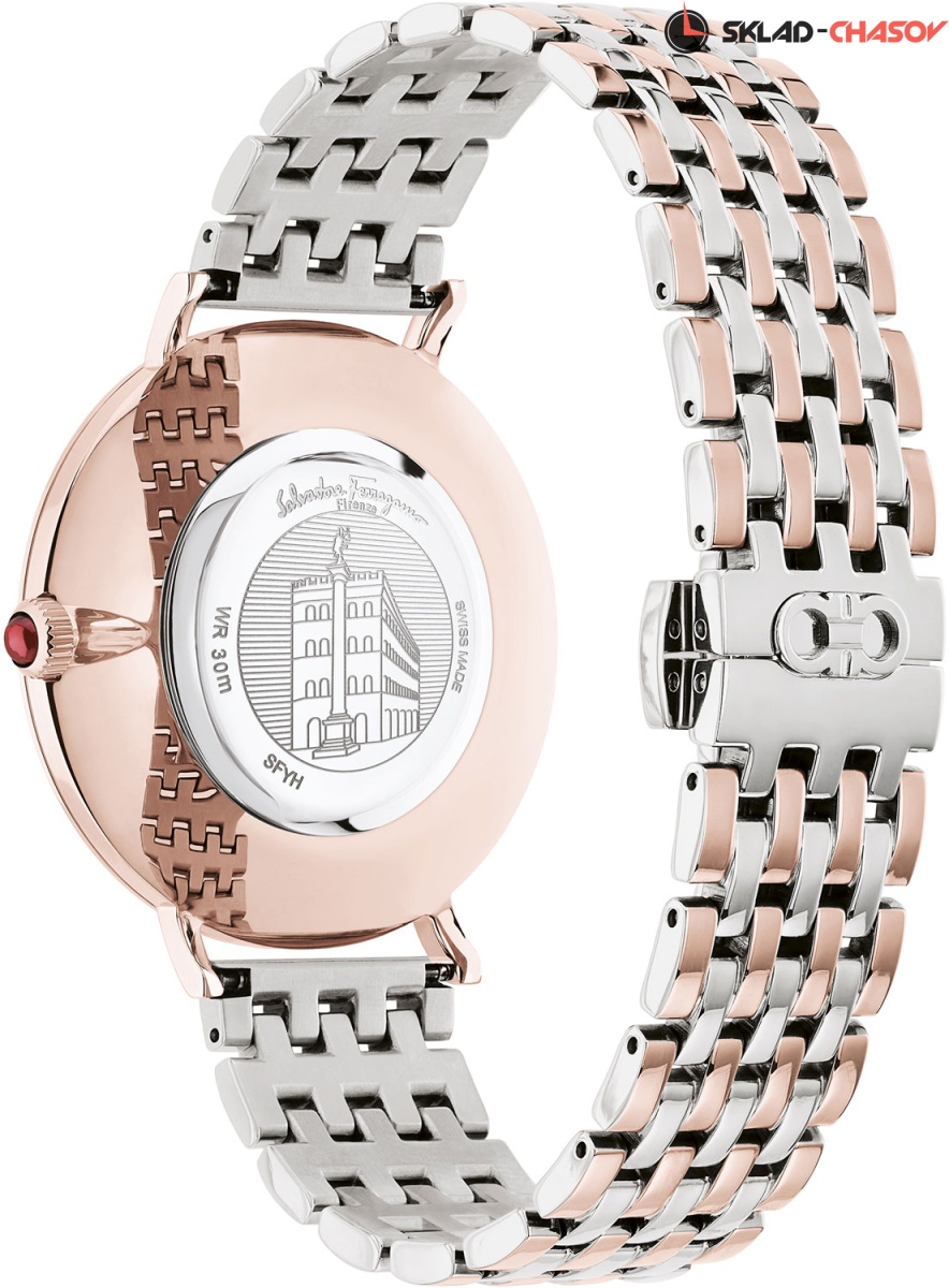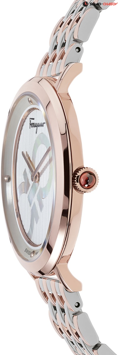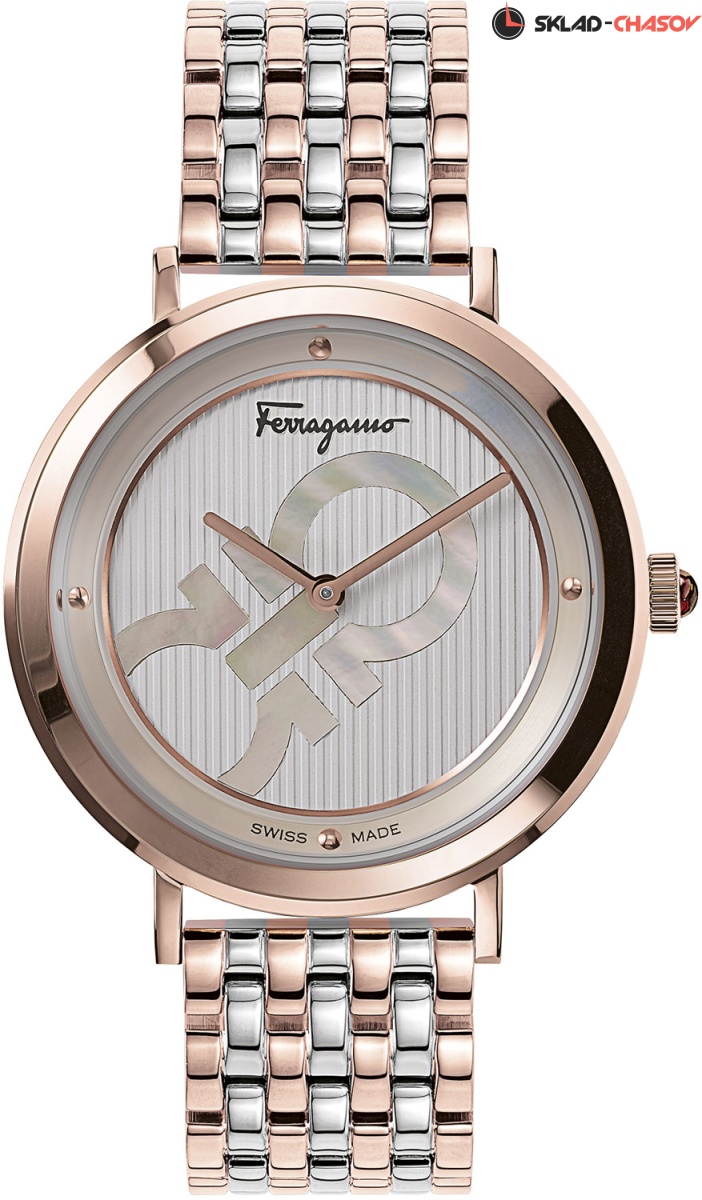 Эти модные женские часы будут прекрасным дополнением к любому наряду. Они подчеркнут неповторимость и очаровательность женской натуры. Ferragamo Logomania 36mm. Круглый полированный корпус изготовлен из нержавеющей стали. Циферблат декорирован вертикальными рельефными линиями и крупным изображением фирменного логотипа, выполненного из перламутра. Метки в виде точек. Закругленные прямоугольные стрелки. Рифленая заводная головка украшена камнем в форме кабошона. Браслет с раскладывающейся застежкой.