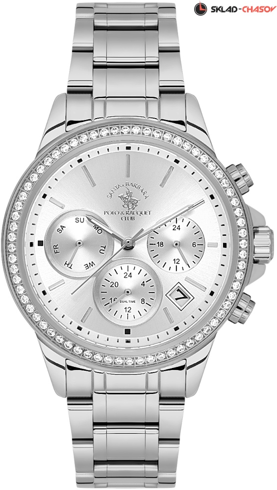 Элегантные женские часы Santa Barbara Polo & Racquet Club (артикул SB.1.10621-1) сочетают функциональность и изысканный дизайн. Модель с круглым корпусом из гипоаллергенной нержавеющей полированной стали привлекает внимание безелем, декорированным россыпью сверкающих кристаллов. Циферблат с эффектом солнечных лучей (Sunray) украшен фирменным логотипом и штриховыми метками, стрелки с люминесцентным покрытием обеспечивают удобное считывание времени в темноте.