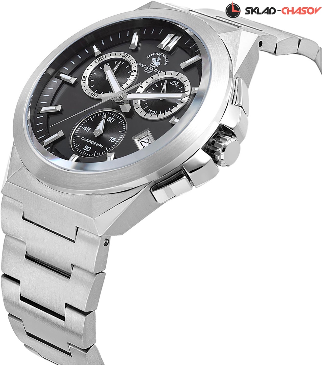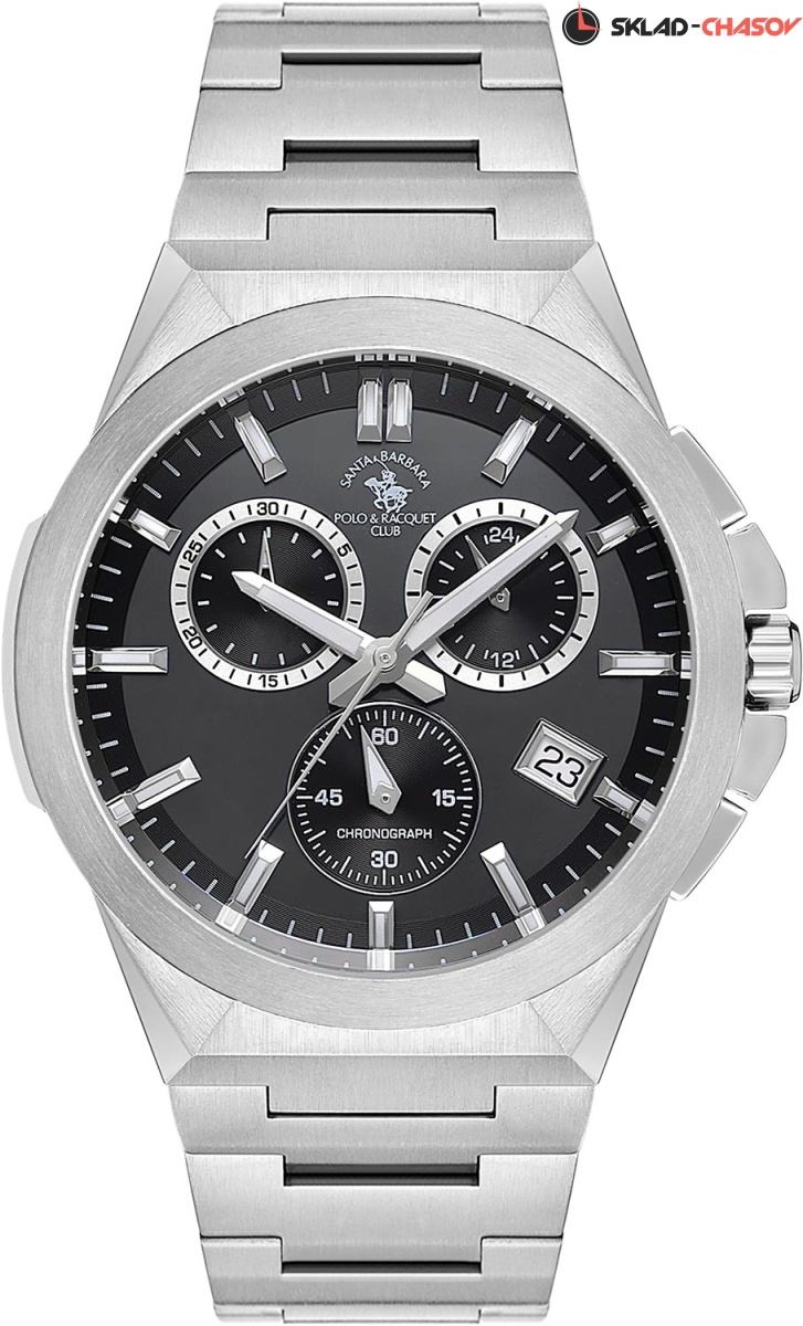 Функциональные мужские часы-хронограф с секундомером. Стальной корпус с матовой отделкой. Двухуровневый матовый циферблат украшен фирменным логотипом. Накладные метки в виде штрихов. 12-ти и 24-х часовой формат времени. Окошко даты находится в положении 4 часа.