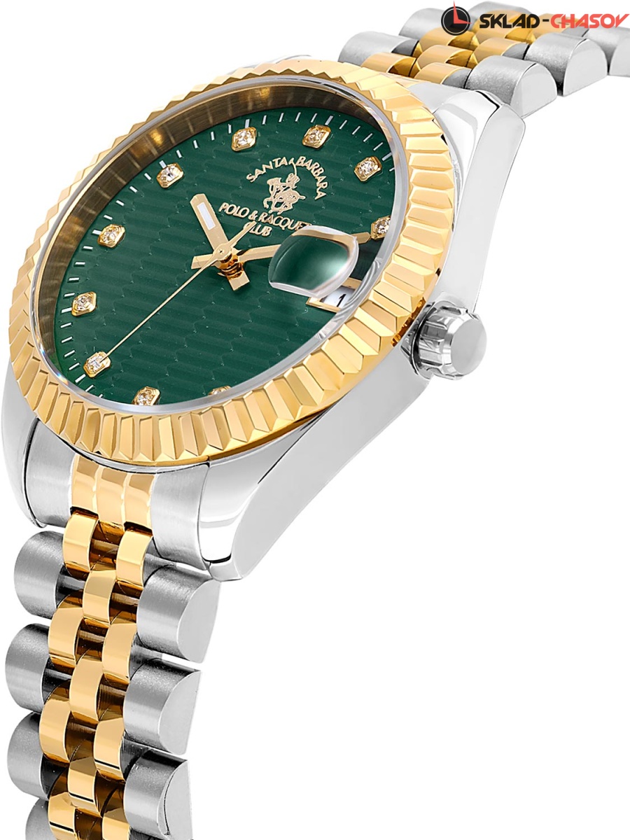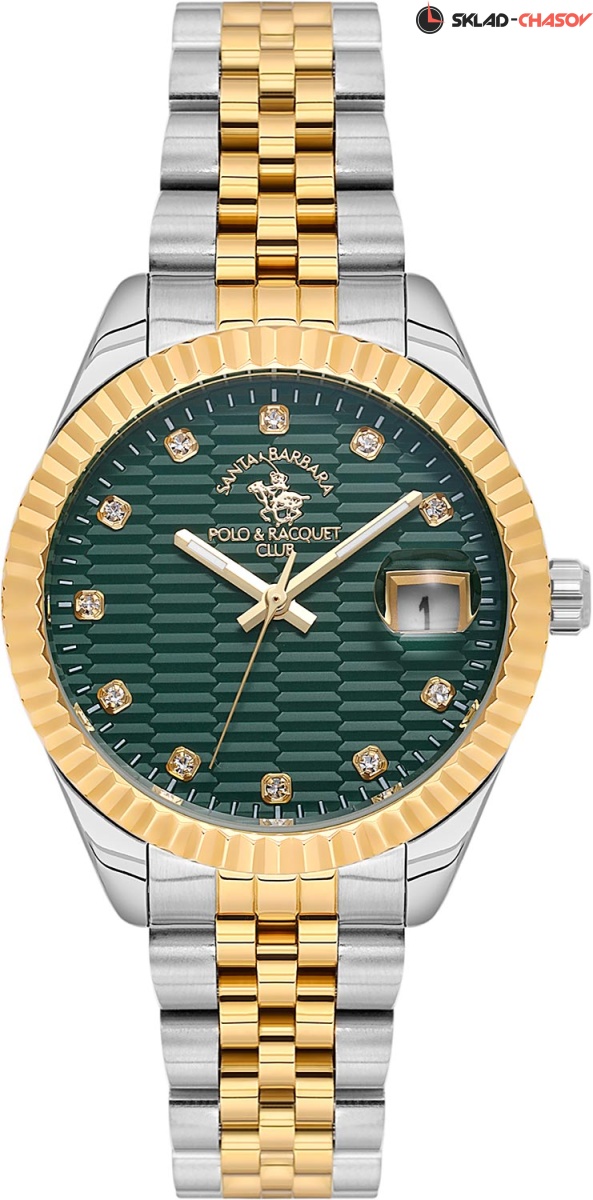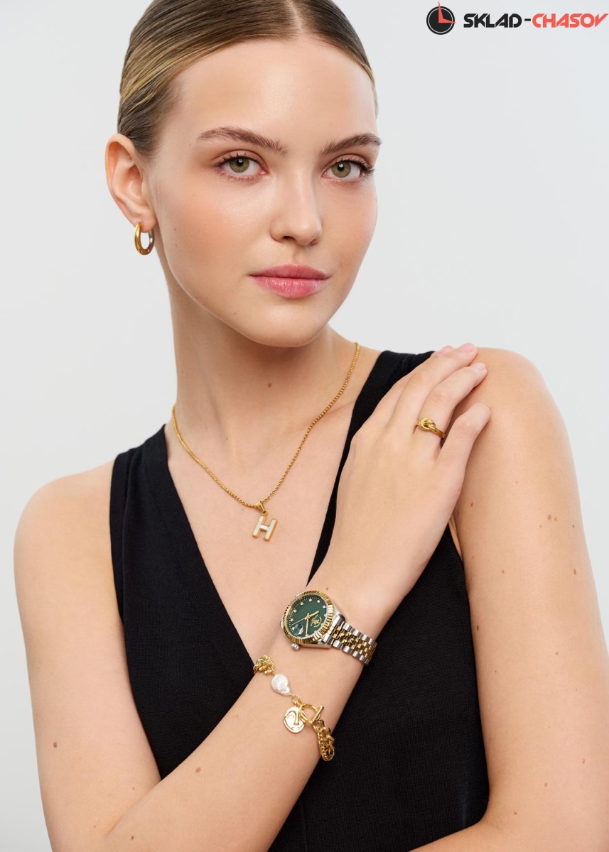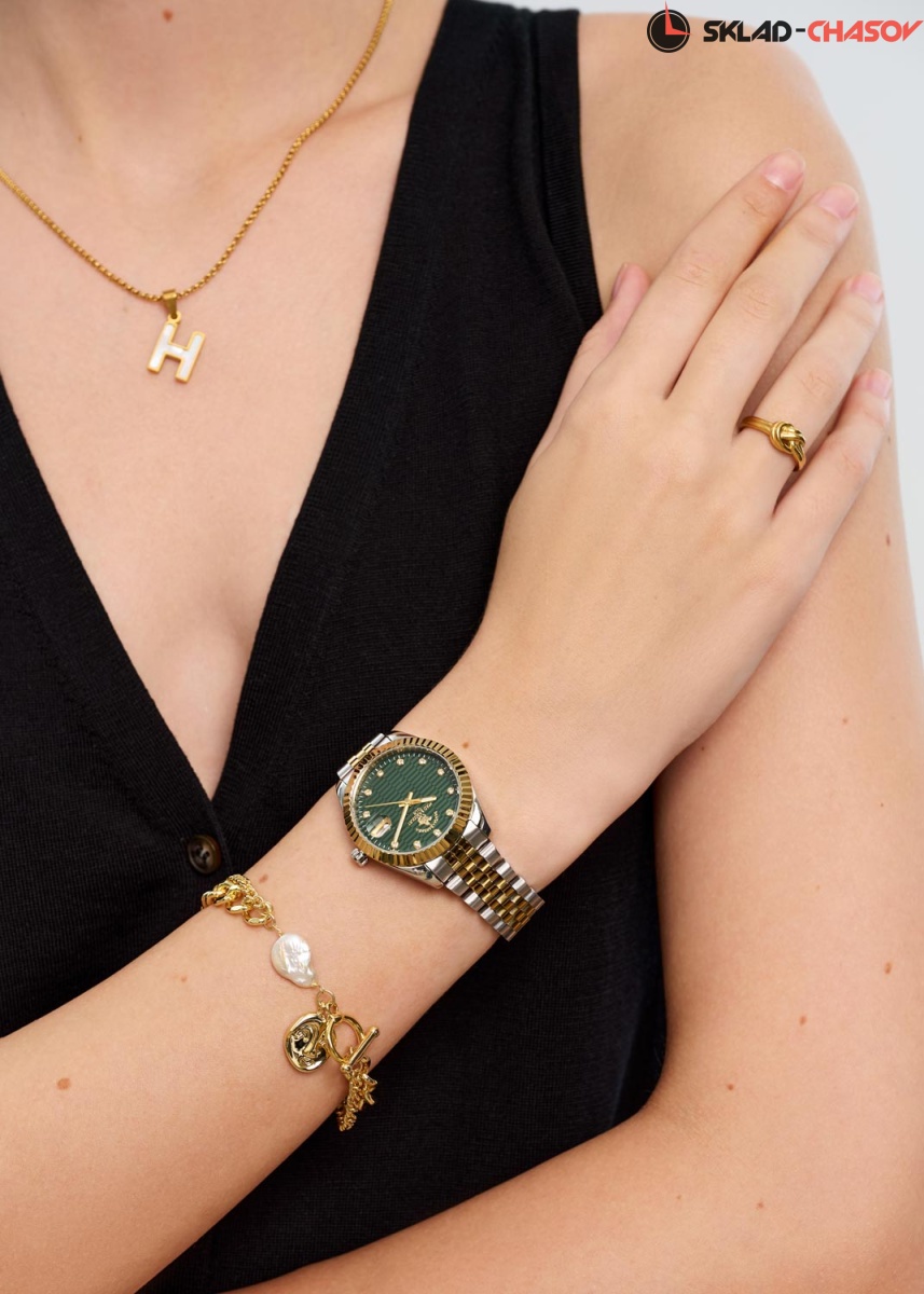 Женские часы с надежным японским механизмом. Циферблат украшен фирменным логотипом. Метки в виде точек, украшенных кристаллами. Окошко даты с увеличительным стеклом.