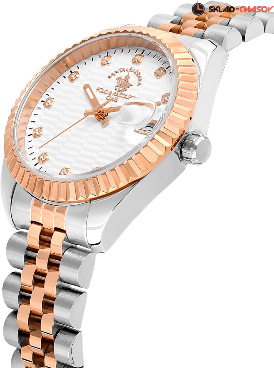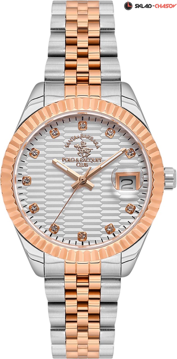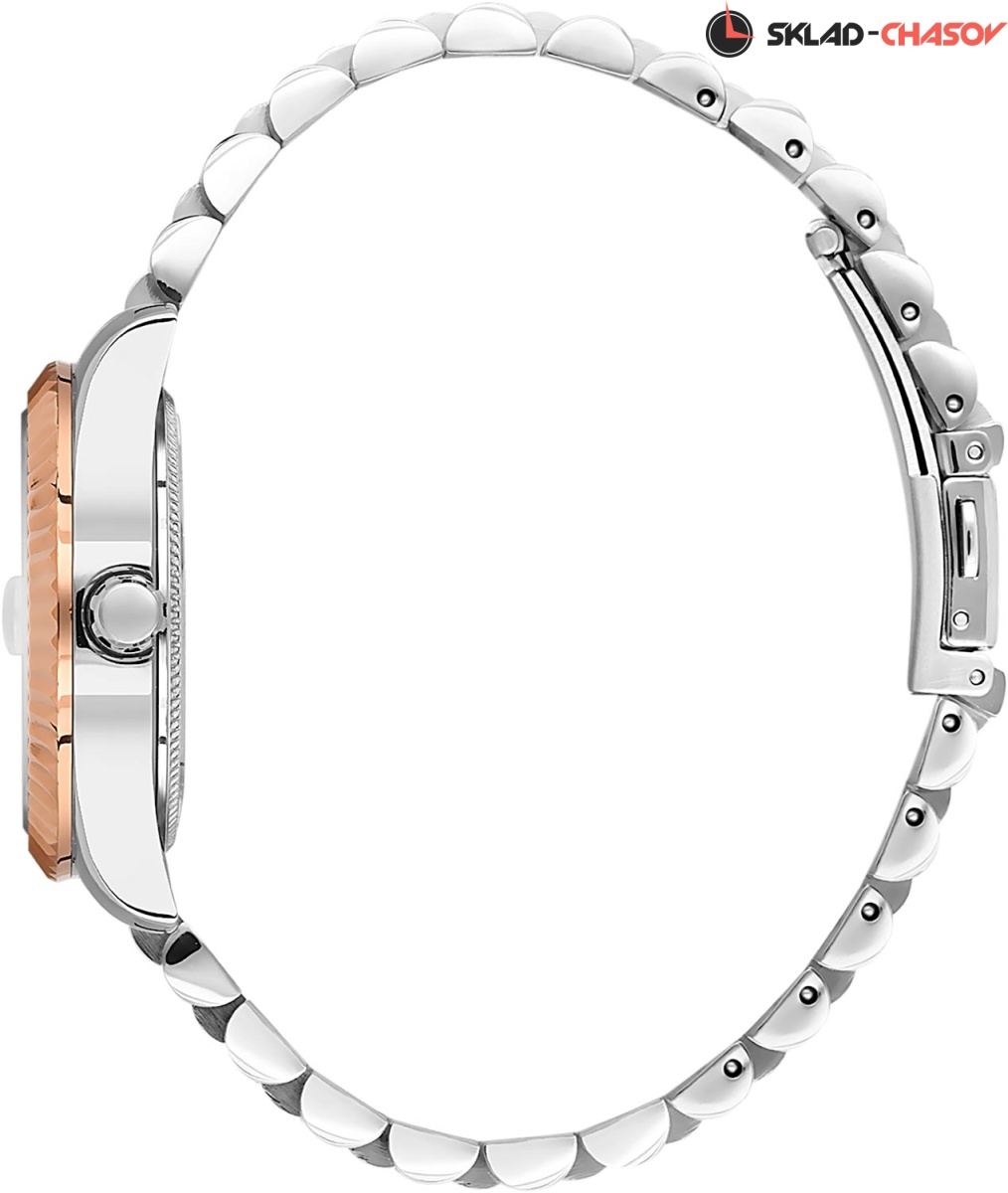 Женские часы с надежным японским механизмом. Циферблат украшен фирменным логотипом. Метки в виде точек, украшенных кристаллами. Окошко даты с увеличительным стеклом.