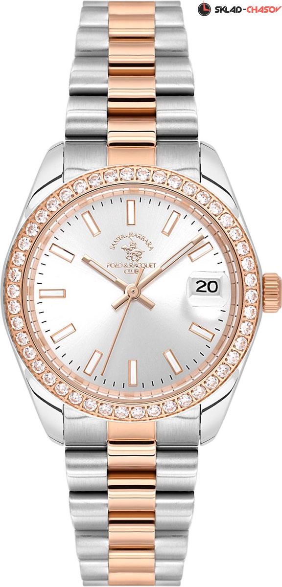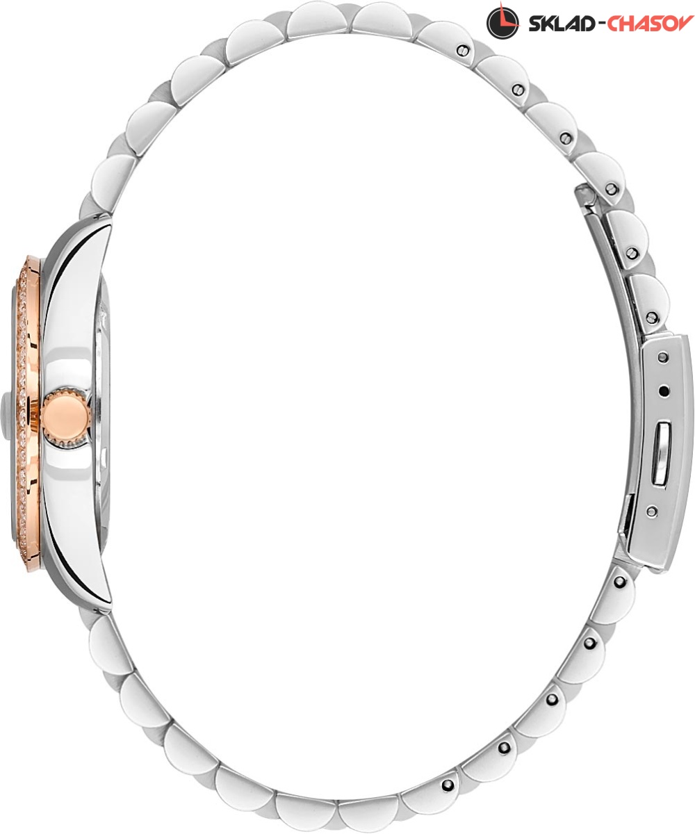 Кварцевые женские наручные часы. Круглый стальной корпус с полированной и матовой отделкой. Безель украшен паве из сверкающих кристаллов. Циферблат выполнен по технологии Sunray (солнечные лучи) и украшен фирменным логотипом. Накладные метки в виде штрихов.