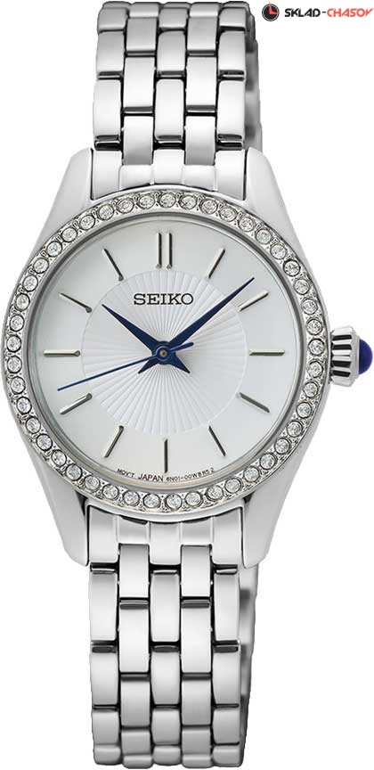 Элегантные часики от компании Seiko придутся по душе утонченной женской натуре. Discover More. Женские часы с круглым стальным корпусом. Защищены от магнитных полей (до 4800 А/м). Циферблат с метками в виде штрихов выполнен по технологии Sunray (солнечные лучи). Рифленая заводная головка украшена камнем в форме кабошона. Батарея рассчитана на 3 года. Браслет с тройной раскладывающейся застежкой.