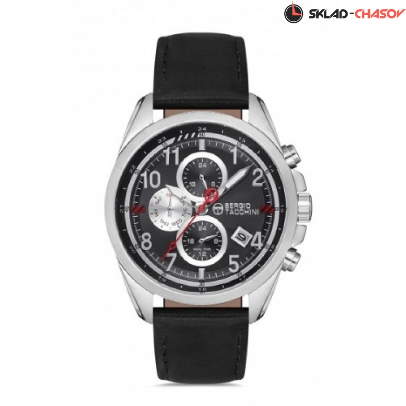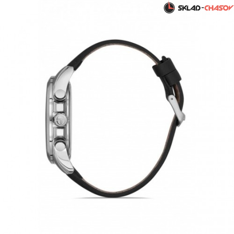 Наручные часы мужские, кварцевые с мех. индикацией, стальной корпус серебристого цвета, черный циферблат, черный ремешок из кожи теленка, дата, день недели