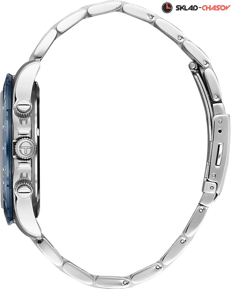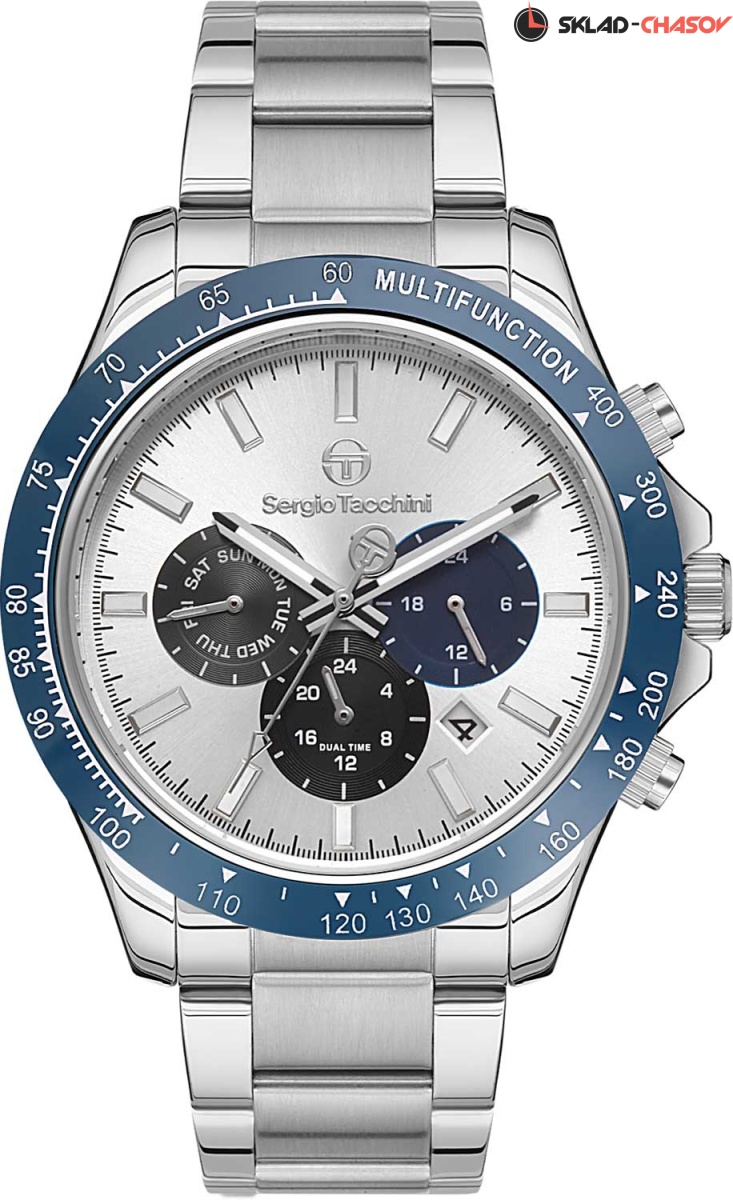 Наручные часы мужские, кварцевые с мех. индикацией, стальной корпус серебристого цвета с керамическим безелем синего цвета , серый циферблат, браслет из нержавеющей стали серебристого цвета, дата, день недели