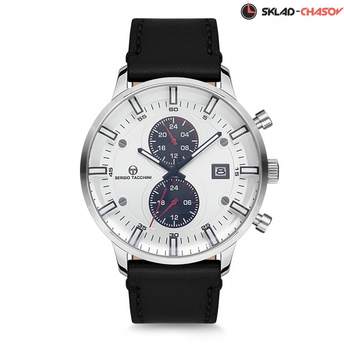 Корпус: нержавеющая сталь 316L, цвет серебристый, размер 45 мм, водозащита 10 АТМ. Ремешок: натуральная кожа, цвет серебристый, размер 22x20 мм. Механизм: японский кварцевый, калибр Miyota JP11-00C. Цвет циферблата белый, стекло минеральное.