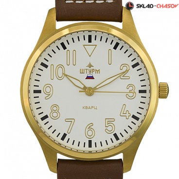 Модель отличается интересным дизайном. Корпус покрыт тонким слоем желтого золота. Циферблат снежно-белого цвета, цифры и стрелки – золотые. Изюминкой этих часов можно считать фирменный знак «Штурм», с фрагментом флага России. Завершающим аккордом модели стал коричневый кожаный ремешок. Модель может органично вписаться в мужской образ любого стиля.