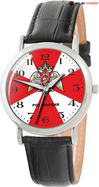Коллекция часов Патриот создана с символикой значимых и важнейших событий в истории России и государственных учреждений нашей страны. Российские часы посвященные символам величия СССР и России. Патриот. Унисекс. Двухцветный циферблат украшен изображением герба Росгвардии. Круглый латунный корпус. Кожаный ремешок.