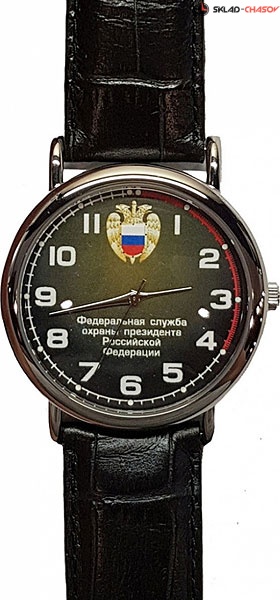 Коллекция часов Патриот создана с символикой значимых и важнейших событий в истории России и государственных учреждений нашей страны. Российские часы посвященные символам величия СССР и России. Патриот. Унисекс. Циферблат украшен изображением герба Федеральной службы охраны президента Российской Федерации. Круглый латунный корпус. Кожаный ремешок.
