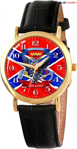 Коллекция часов Патриот создана с символикой значимых и важнейших событий в истории России и государственных учреждений нашей страны. Российские часы посвященные символам величия СССР и России. Патриот. Унисекс. Циферблат в цветах флага Новороссии украшен изображением герба Новороссии. Круглый латунный корпус. Кожаный ремешок.