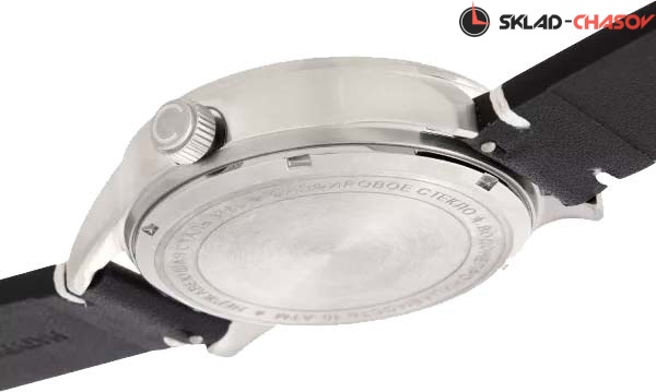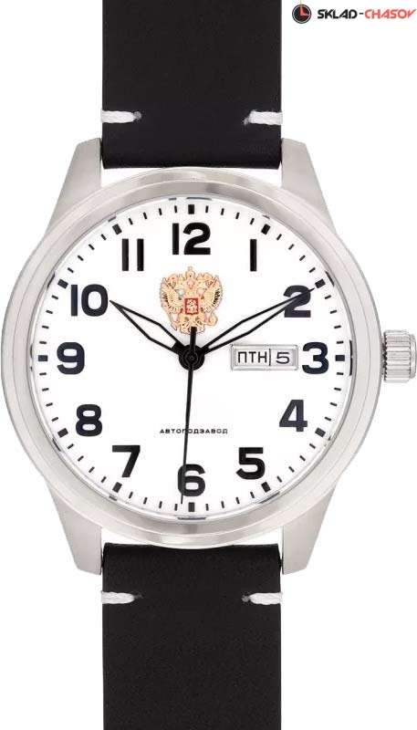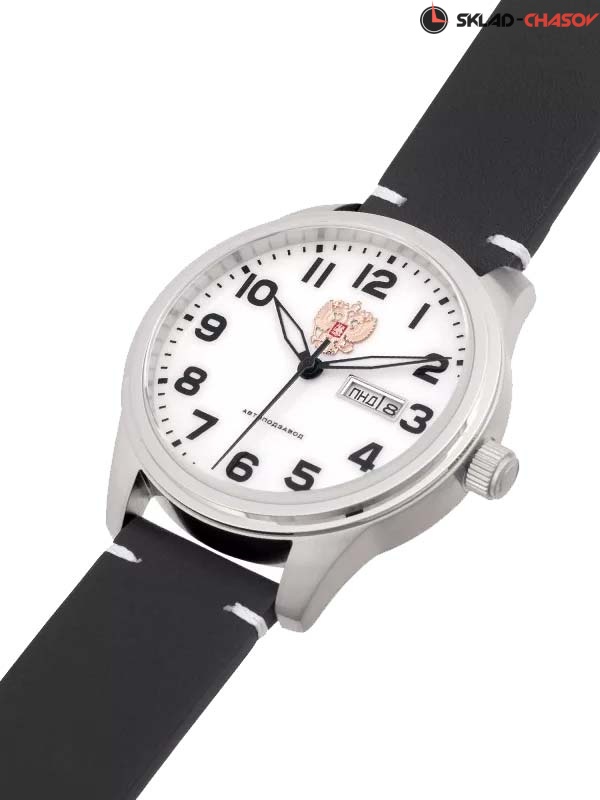 Традиция. Мужские механические часы с автоподзаводом. В механизме 21 камень, частота 21600 полуколебаний в час. Запас хода 42 часа. Круглый стальной корпус. Окошко даты и дня недели в положении 3 часа. Метки в виде арабских цифр. Изображение герба РФ на циферблате. Рифленая заводная головка. Удобный ремешок из натуральной кожи с классической застежкой.