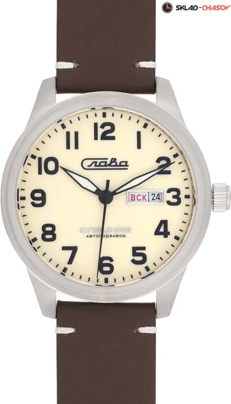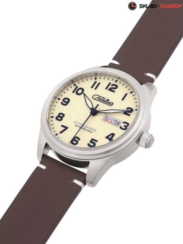 Традиция. Мужские механические часы с автоподзаводом. В механизме 21 камень, частота 21600 полуколебаний в час. Запас хода 42 часа. Круглый стальной корпус. Окошко даты и дня недели в положении 3 часа. Метки в виде арабских цифр. Надпись «Спецназ» и логотип на циферблате. Рифленая заводная головка. Удобный ремешок из натуральной кожи с классической застежкой.