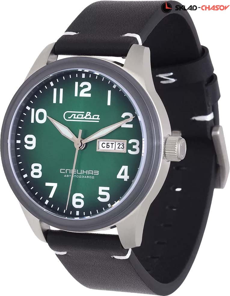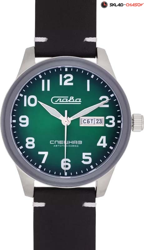 Традиция. Мужские механические часы с автоподзаводом. В механизме 21 камень, частота 21600 полуколебаний в час. Запас хода 42 часа. Круглый стальной корпус. Окошко даты и дня недели в положении 3 часа. Метки в виде арабских цифр. Надпись «Спецназ» и логотип на циферблате. Рифленая заводная головка. Удобный ремешок из натуральной кожи с классической застежкой.