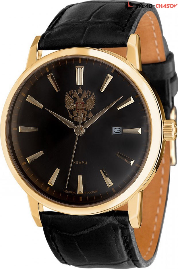 Надежные и удобные часы гармонично вписываются в повседневный стиль одежды. Традиция. Циферблат с окошком даты украшен изображением герба России. Круглый корпус. Задняя крышка из нержавеющей стали. Ремешок из натуральной кожи. Классическая застежка.