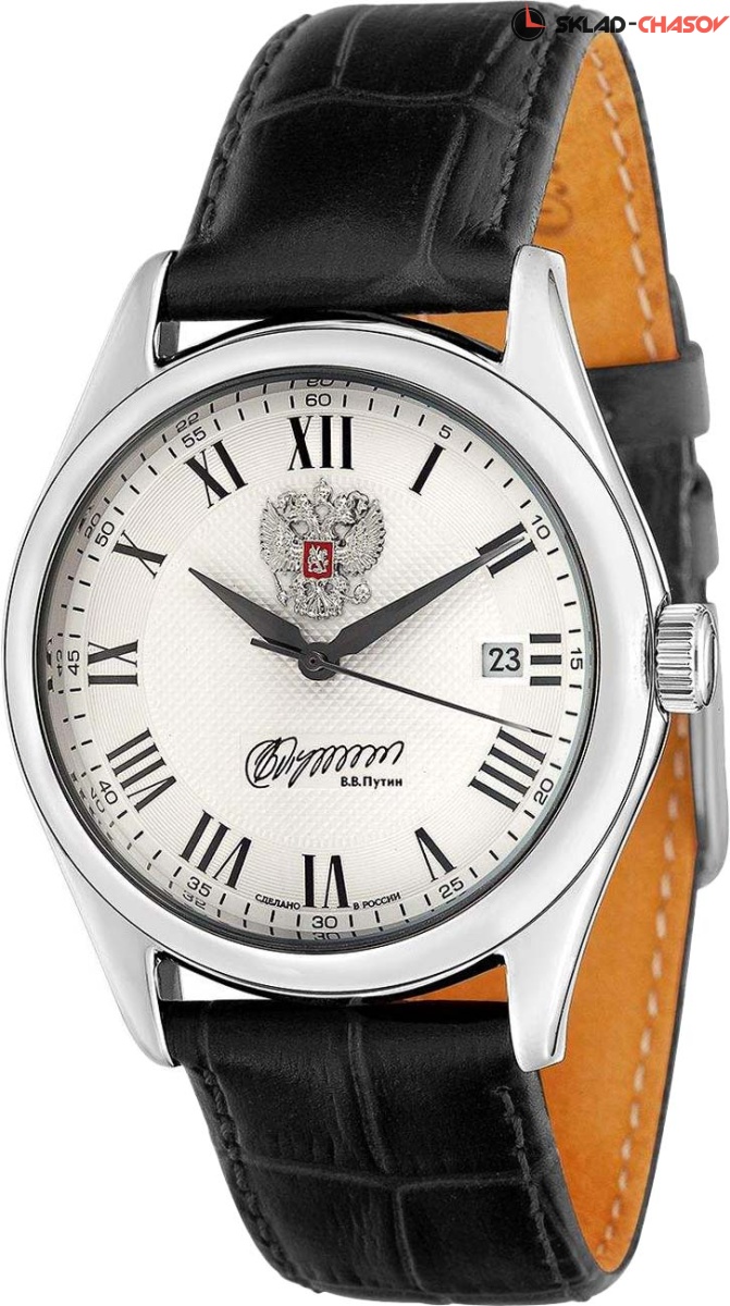 Сдержанный классический дизайн и актуальные элегантные нотки – выбор людей с отточенным стилем. Премьер. На циферблате изображение герба Российской Федерации и автографа В.В. Путина. В механизме 21 камень, частота 21600 полуколебаний в час. Запас хода 42 часов. Возможность ручного завода. Метки в виде римских цифр. Окошко даты. Круглый корпус. Ремешок из натуральной кожи с классической застежкой.