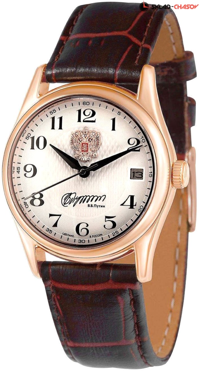 Нежность, которой невозможно не поддаться. Аксессуар, способный искусить даже само время. Премьер. Элегантные часы. В механизме 21 камень, частота 21600 полуколебаний в час. Круглый стальной корпус. На циферблате изображение герба Российской Федерации и автографа В.В. Путина. Центральная часть циферблата украшена узором из пересекающихся линий, зона меток дополнена концентрическим декоративным узором. Острые стрелки в стиле Alpha. Метки в виде арабских цифр. Окошко даты находится в положении 3 часа. Рифленая заводная головка. Текстурированный кожаный ремешок с классической застежкой.