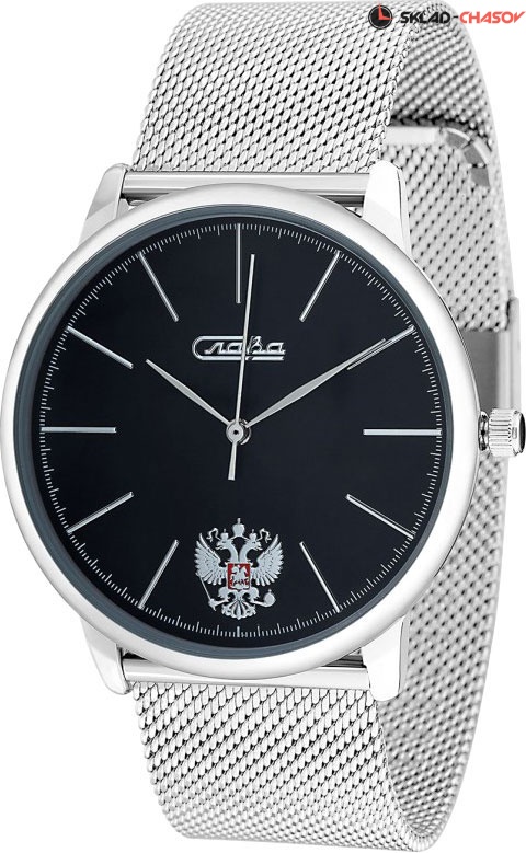 Популярные мужские отечественные часы в простом стиле без чрезмерной вычурности. Традиция. На циферблате изображение герба России. Круглый корпус с задней крышкой из нержавеющей стали. Браслет миланского плетения.