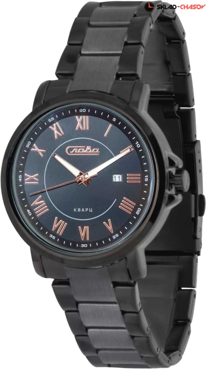 Традиция. Мужские часы с круглым корпусом. Циферблат с метками в виде римских цифр. Окошко даты находится в положении 3 часа. Заводная головка с защитой. Браслет с раскладывающейся застежкой.