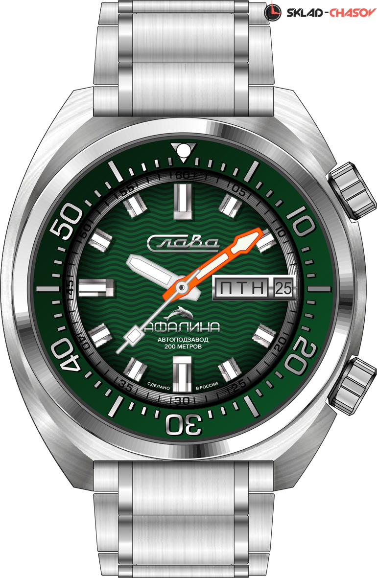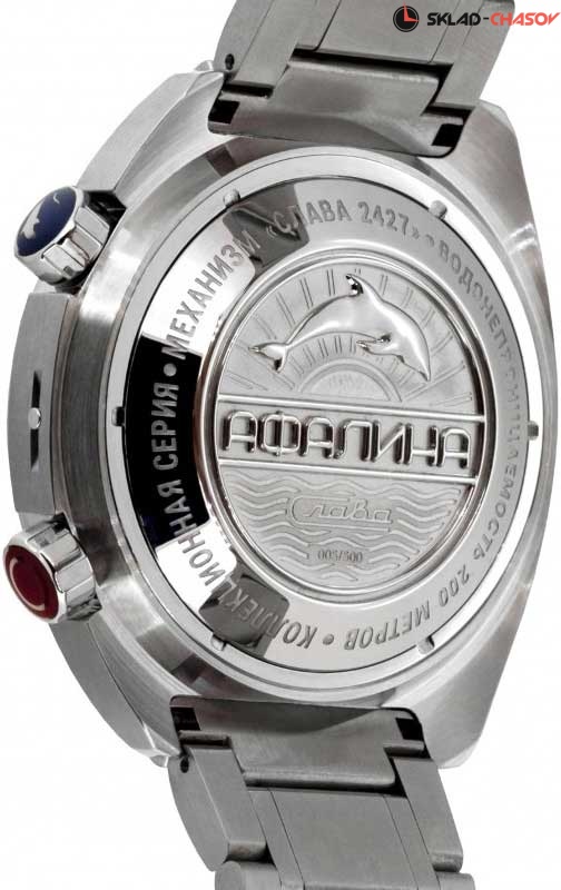 Коллекционные часы ''Афалина'' - это не просто функциональный аксессуар, это символ вашей заботы о природе и охране животных. Часть средств от продажи каждых часов ''Афалина'' перечисляется в центр спасения дельфинов ''Дельфа''. Мужские механические дайверские часы в прочном стальном корпусе. Лимитированная серия - 500 экземпляров. Основная заводная головка расположена на корпусе ближе к отметке ''4 часа'', она позволяет настраивать время и заводить часы перед погружением. С помощью второй головки, расположенной у отметки ''2 часа'', можно управлять вращающимся внутренним кольцом безеля и фиксировать его в нужном положении. Окошко даты и дня недели находится в положении ''3 часа''. Стальной браслет оснащен профессиональной ''дайвинг-застежкой'' с удлинением для гидрокостюма.