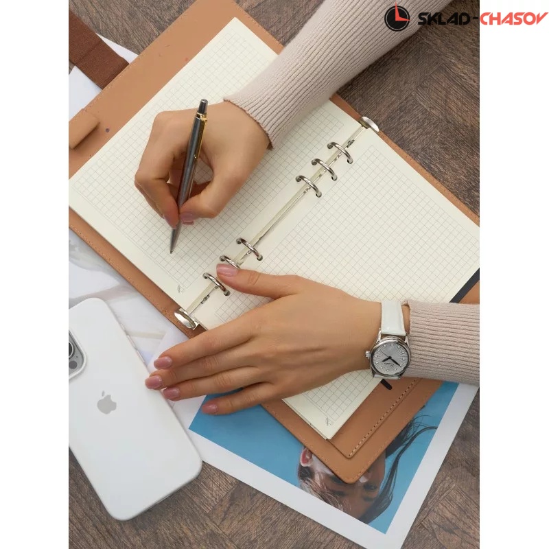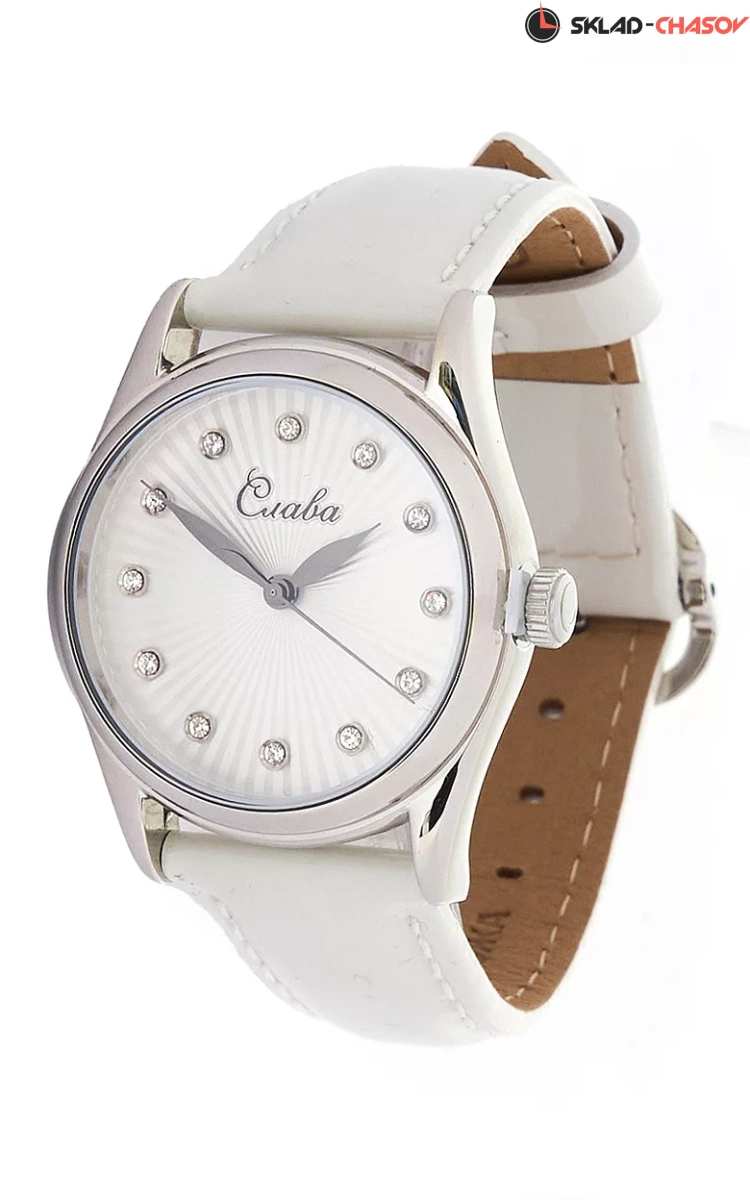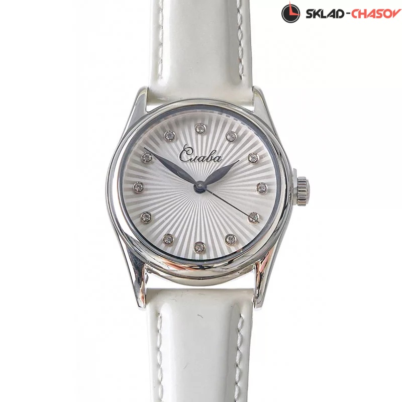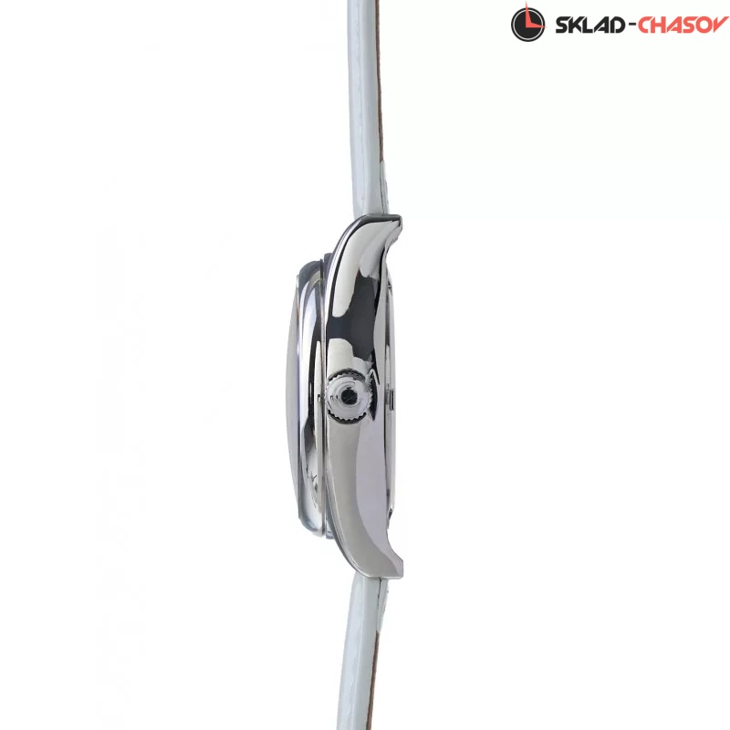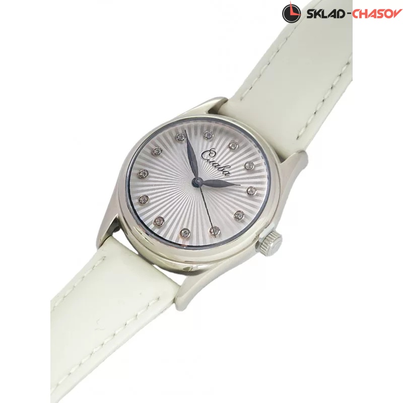 Сенат. Женские наручные часы. Стальной круглый корпус. Циферблат защищен прочным сапфировым стеклом. Листовидные стрелки в стиле Feuille. Метки в виде точек, украшенных цирконовыми кристаллами. Рифленая заводная головка. Удобный ремешок из натуральной кожи с классической застежкой.