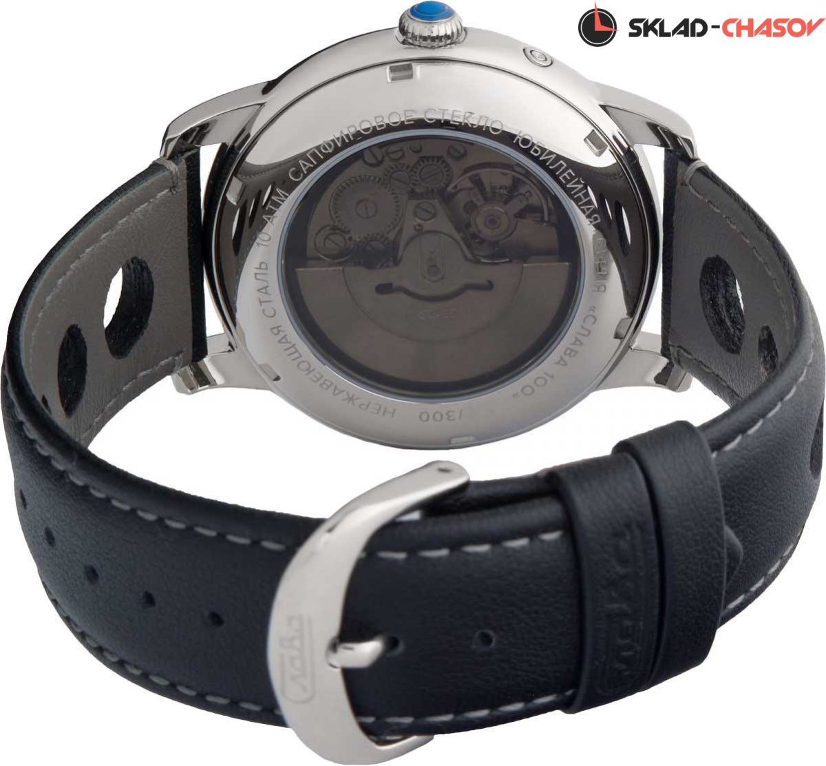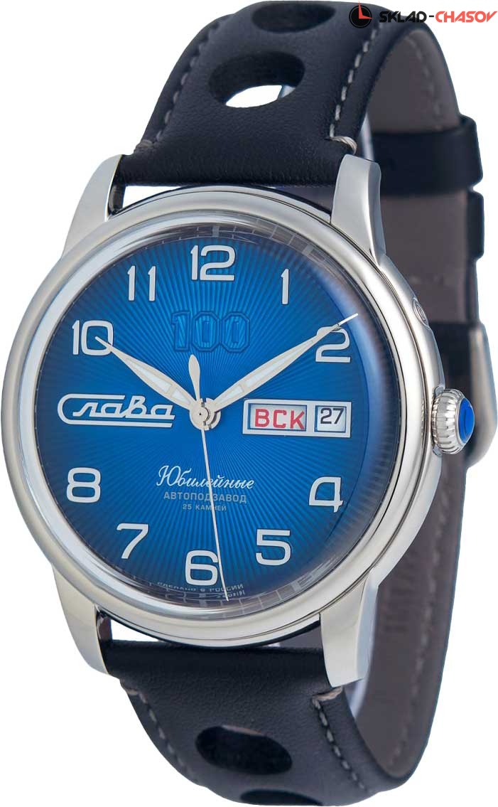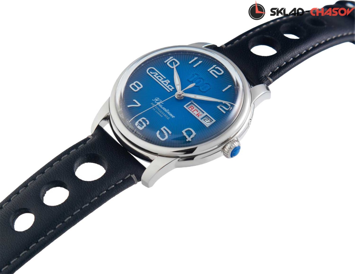 Лимитированные часы от «Слава» — стильный и элегантный экземпляр для вашей коллекции. Юбилейные. Лимитированная серия — 300 экземпляров. В механизме 25 камней, частота 18000 полуколебаний в час. Запас хода до 40 часов. Противоударное устройство оси баланса. Циферблат с метками в виде арабских цифр защищен прочным сапфировым стеклом. Окошко даты и дня недели находится в положении 3 часа. Прозрачная задняя крышка. Ремешок с классической застежкой.