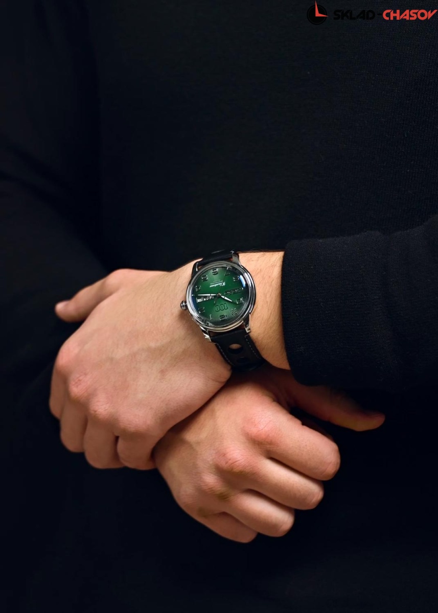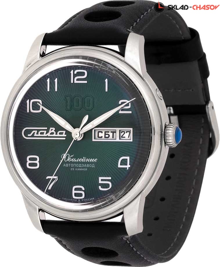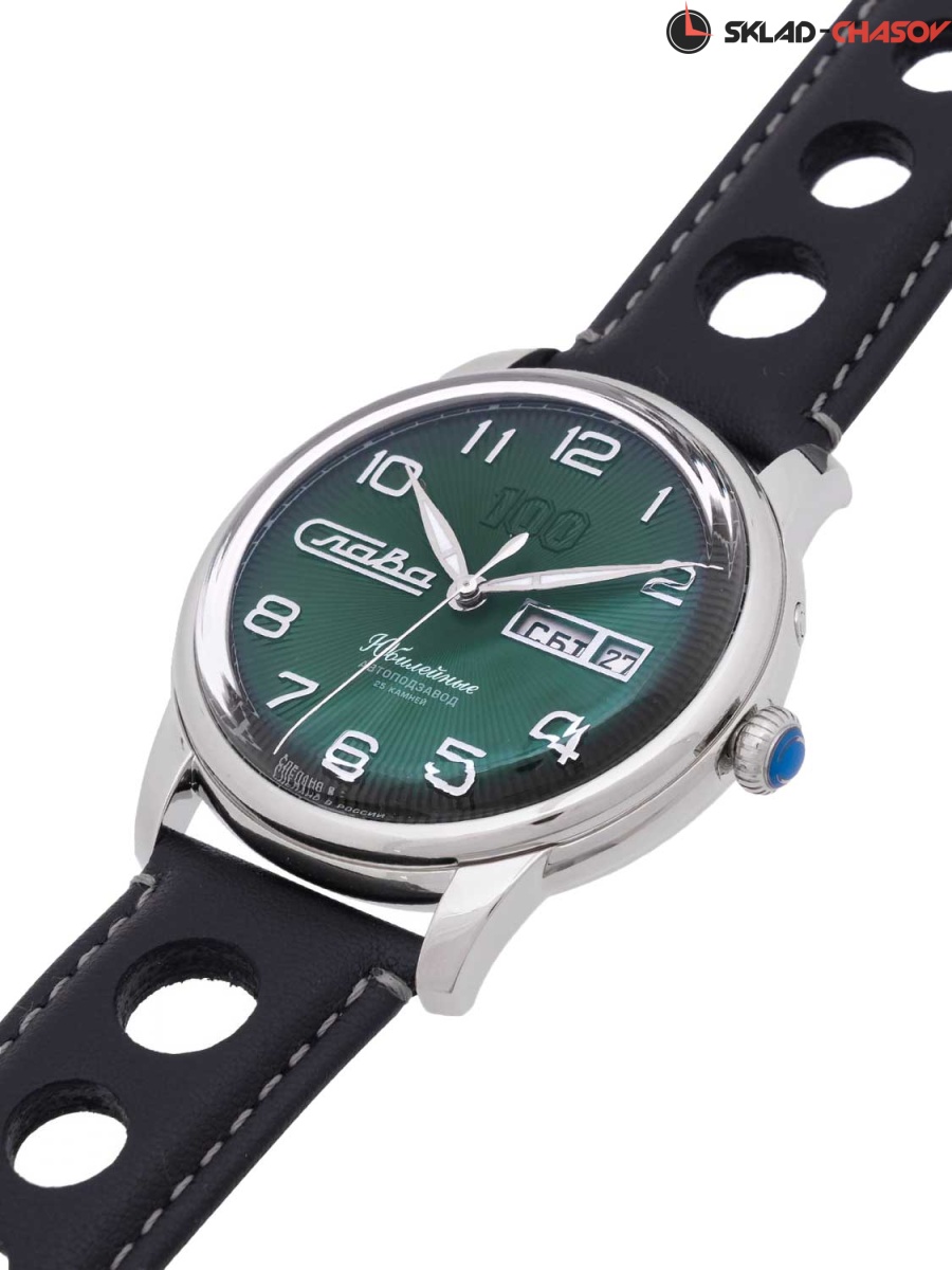 Лимитированные часы от «Слава» — стильный и элегантный экземпляр для вашей коллекции. Юбилейные. Лимитированная серия — 300 экземпляров. В механизме 25 камней, частота 18000 полуколебаний в час. Запас хода до 40 часов. Противоударное устройство оси баланса. Циферблат с метками в виде арабских цифр защищен прочным сапфировым стеклом. Окошко даты и дня недели находится в положении 3 часа. Прозрачная задняя крышка. Ремешок с классической застежкой.
