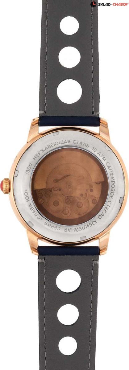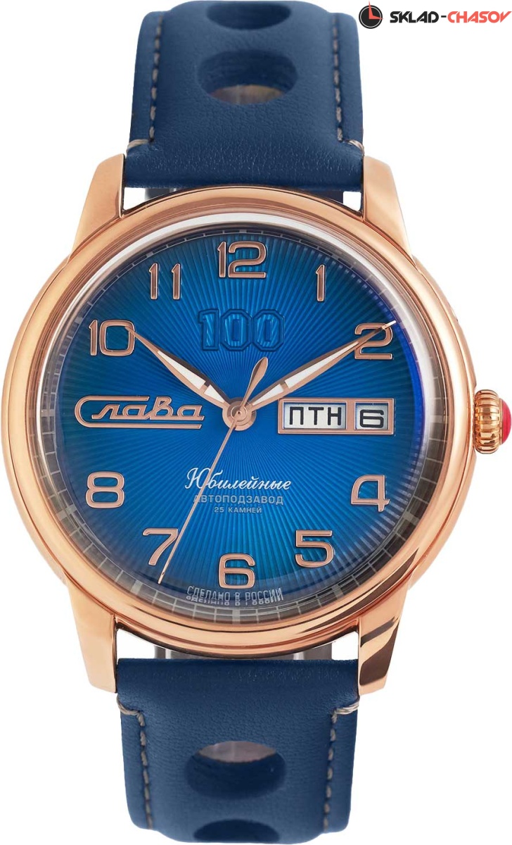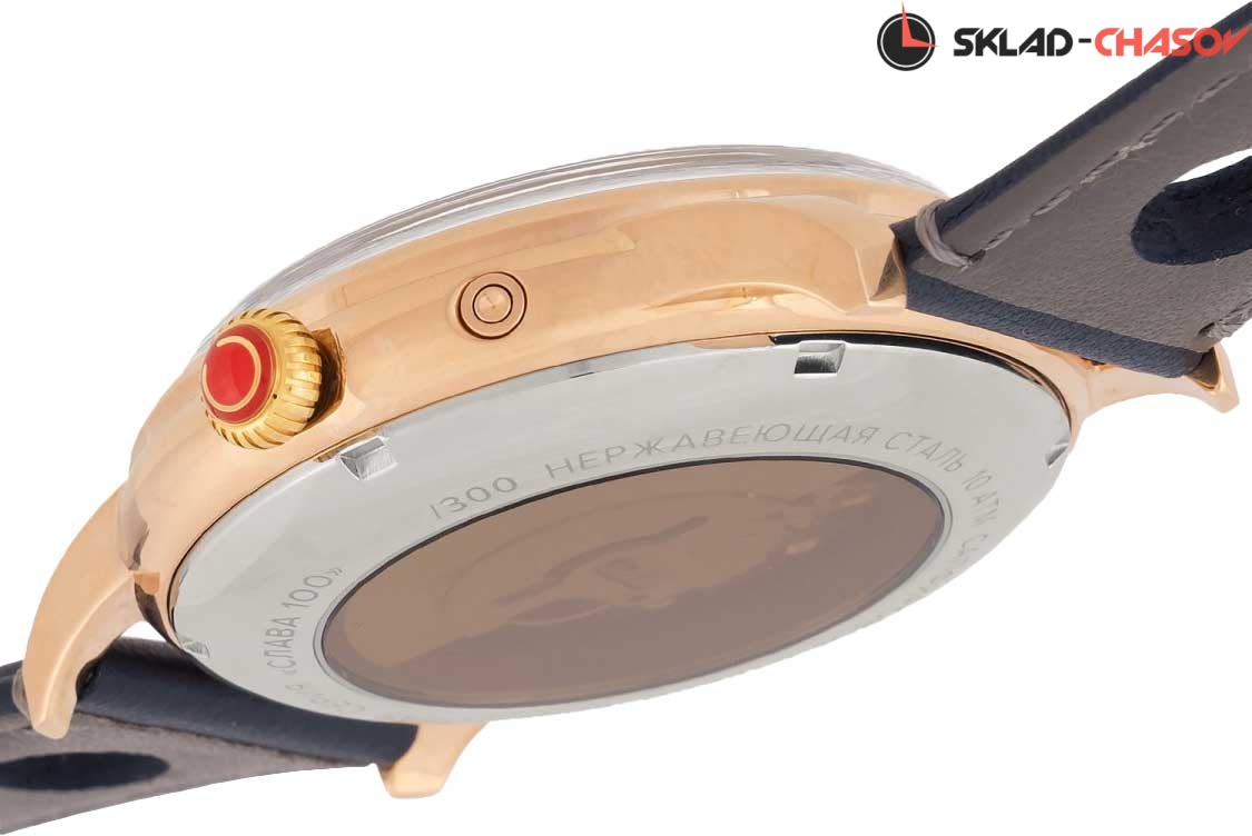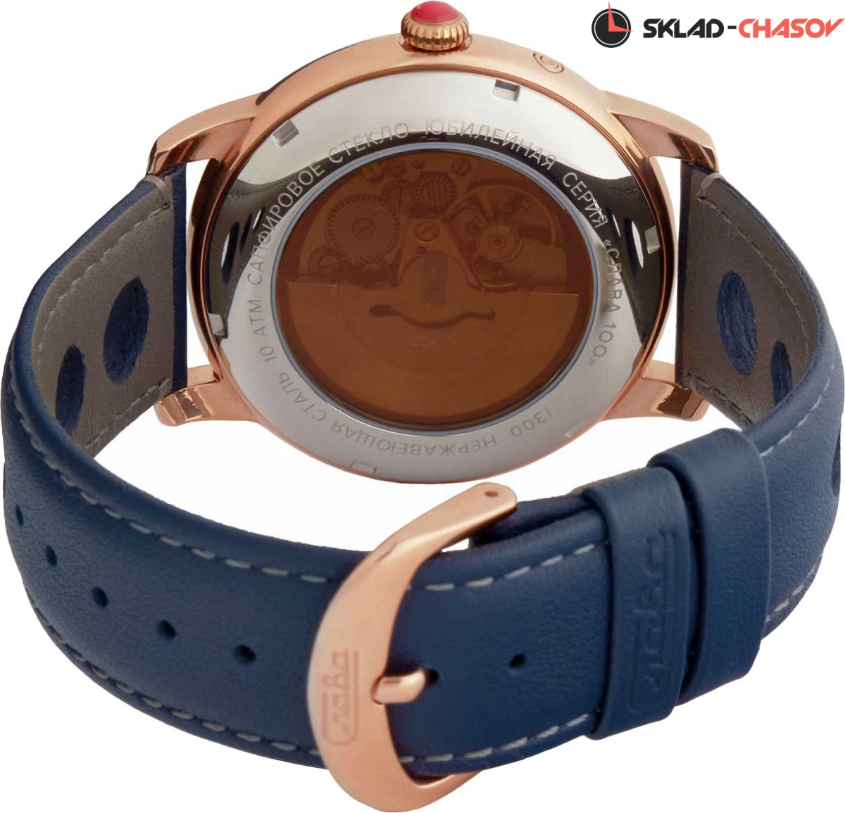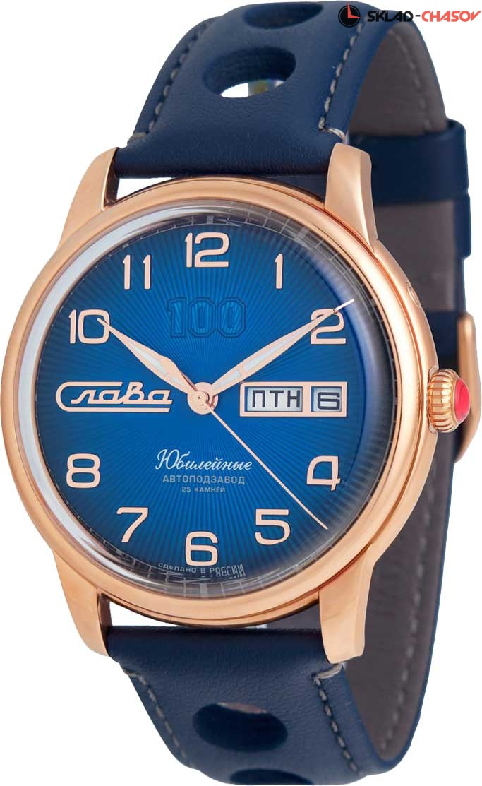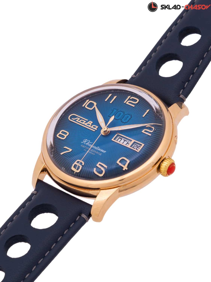 Лимитированные часы от «Слава» — стильный и элегантный экземпляр для вашей коллекции. Юбилейные. Лимитированная серия — 300 экземпляров. В механизме 25 камней, частота 18000 полуколебаний в час. Запас хода до 40 часов. Противоударное устройство оси баланса. Циферблат с метками в виде арабских цифр защищен прочным сапфировым стеклом. Окошко даты и дня недели находится в положении 3 часа. Прозрачная задняя крышка. Ремешок с классической застежкой.