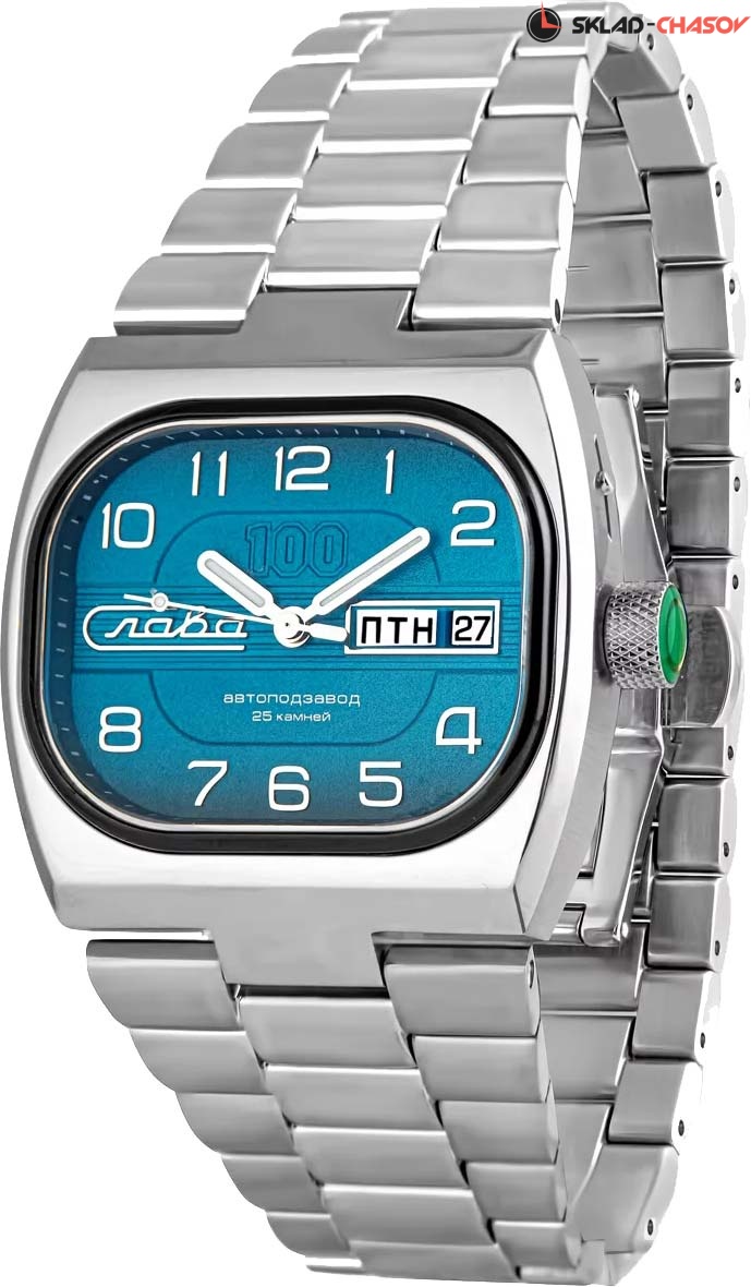 Телевизор. Мужские механические часы с автоподзаводом. Лимитированная серия — 500 экземпляров. В механизме 25 камней. Запас хода 31 час. Прямоугольный корпус. Циферблат с дизайном напоминающим TV экран. Закругленные прямоугольные стрелки в стиле Baton. Метки в виде арабских цифр. Окошко даты и дня недели в положении 3 часа. Рифленая заводная головка. Надежный стальной браслет с раскладывающейся застежкой.
