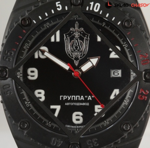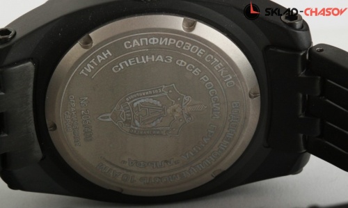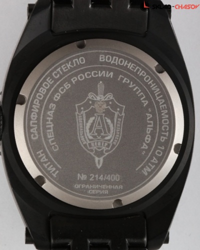 Одна из новых моделей легендарной серии часов "Альфа" в титановом корпусе с черным PVD-покрытием (чернением). Чернение приближает эту модель часов к часам, применяемым в реальных боевых условиях, так как покрытие не отражает света, а значит, не дает опасных в условиях боя бликов. Как и другие модели этой коллекции, часы являются номерными и выпущены специальной ограниченной серией, что подтверждает сертификат и гравировка на задней крышке часов. "Сердце" часов - надежный и точный японский механизм с автоподзаводом. Часы комплектуются специальной защитной решеткой, которая предохраняет от серьезных повреждений прочное антибликовое сапфировое стекло. Корпус и браслет сделаны из титана, наиболее прочного и легкого из всех часовых металлов. Еще одна особенность этой коллекции - качественнная водозащита в 10 АТМ, которая позволяет купаться и плавать, не снимая часов. Часы комплектуются специальным сертификатом, подтверждающим уникальность коллекции и подлинность, а также запасными ремешками.