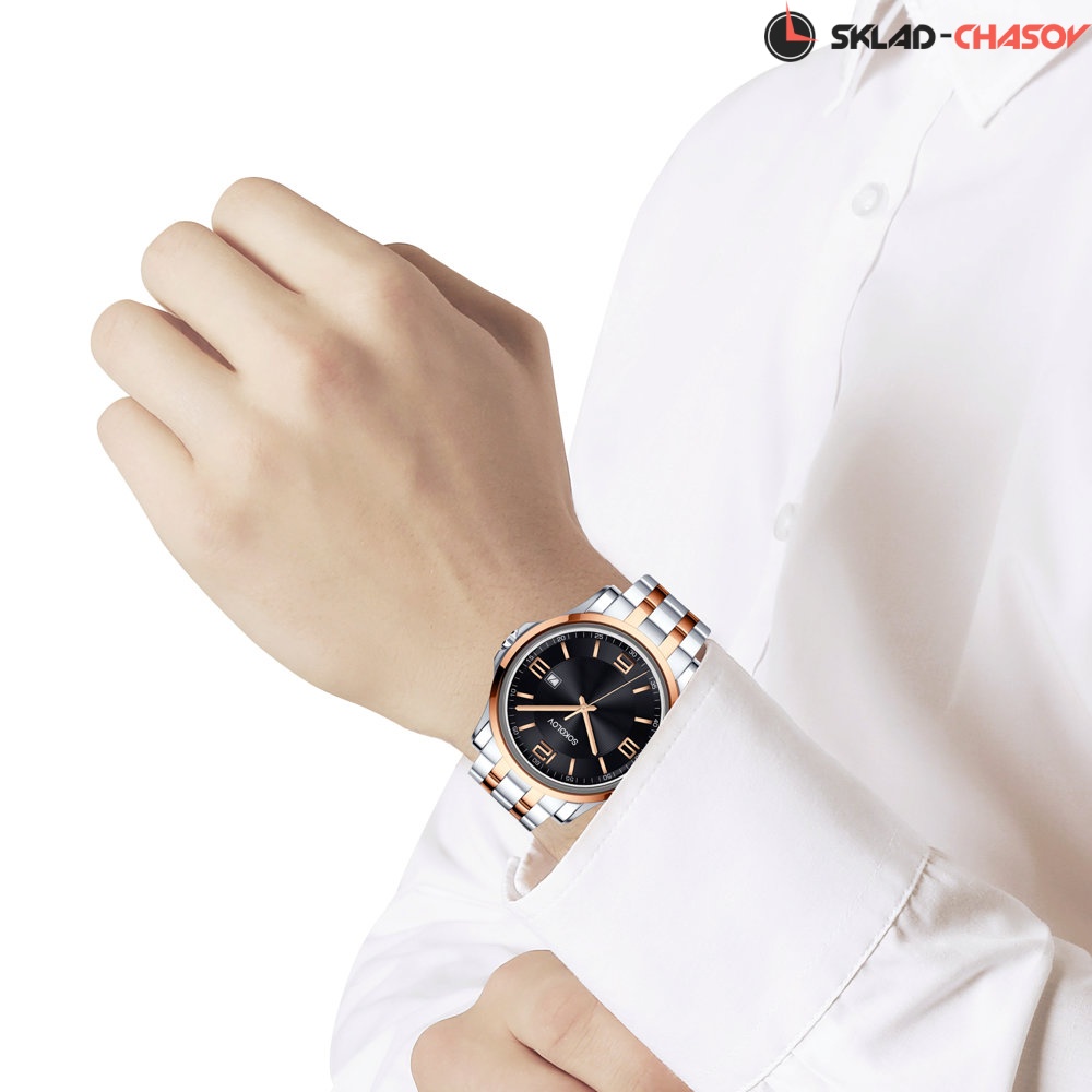Этим огромным миром равноценно правят четыре стихии – земля, вода, воздух и огонь. Именно их силой и величием вдохновлялся создатель коллекции My world. Энергию земли – мощную, надёжную, темпераментную в ритме шумного мегаполиса воплощает линейка мужских стальных часов Streetracer. За безупречный функционал этой модели отвечает японский кварцевый механизм. Для дополнительной влагозащиты в 5 АТМ задняя крышка корпуса фиксируется винтами. В основе дизайна – идеально сбалансированные пропорции, чистота линий корпуса и браслета, синтез сатинированных и полированных деталей. Совершенство прямых гранённых стрелок, радиусных меток и арабских цифр подчёркивают матовое покрытие под часовой индикацией и сатинирование «солнечные лучи» – впечатляющая игра света. Шкала и фирменный логотип выполнены высокой лаковой печатью. Завершает композицию лаконичный индикатор даты. Часы серебристого оттенка с позолоченными рантом и звеньями, чёрным циферблатом подчеркнут характер и стиль обладателя. Твоя жизнь, твои правила!