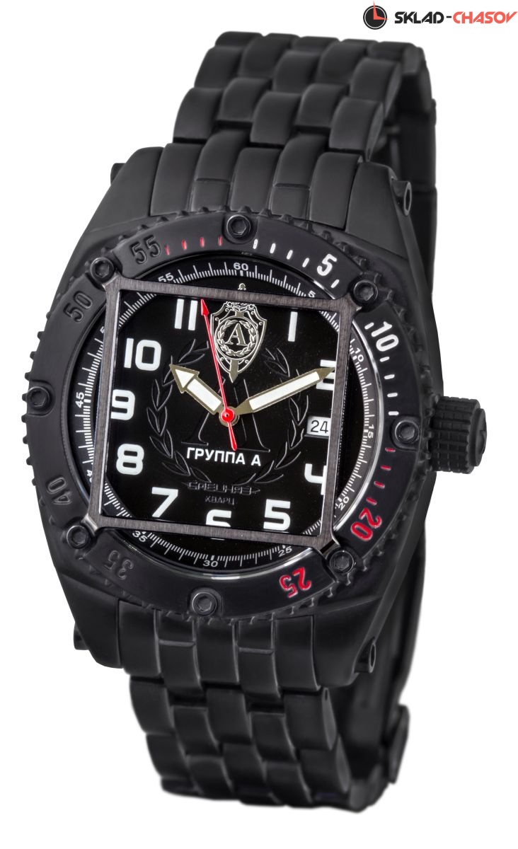Часы в титановом корпусе, с антибликовым сапфировым стеклом и высокой степенью водозащиты, созданные для легендарного спецподразделения ФСБ ''Альфа''. Группа А. Лимитированная серия. Вращающийся безель с защитной рамкой. Браслет с раскладывающейся застежкой.