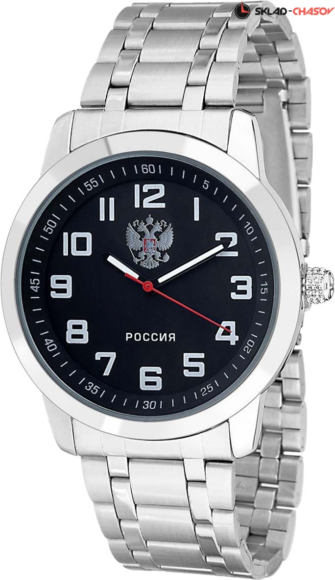 Часы с легкочитаемым циферблатом отлично подойдут для повседневного общения со временем. Атака. Мужские часы. Циферблат с метками в виде арабских цифр украшен гербом России. Браслет с раскладывающейся застежкой.