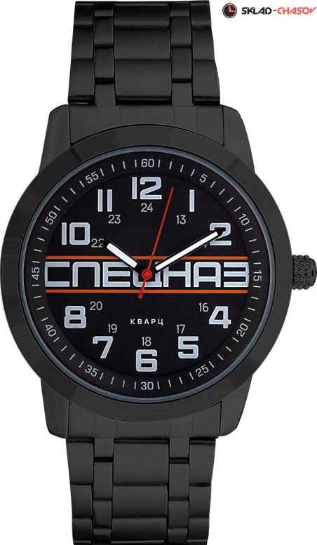 Эти практичные часы великолепно сидят на руке и позволят вам чувствовать себя уверенно в любой обстановке. На циферблате крупная надпись «Спецназ». 12-ти и 24-х часовой формат времени. Задняя крышка из нержавеющей стали. Браслет с раскладывающейся застежкой.