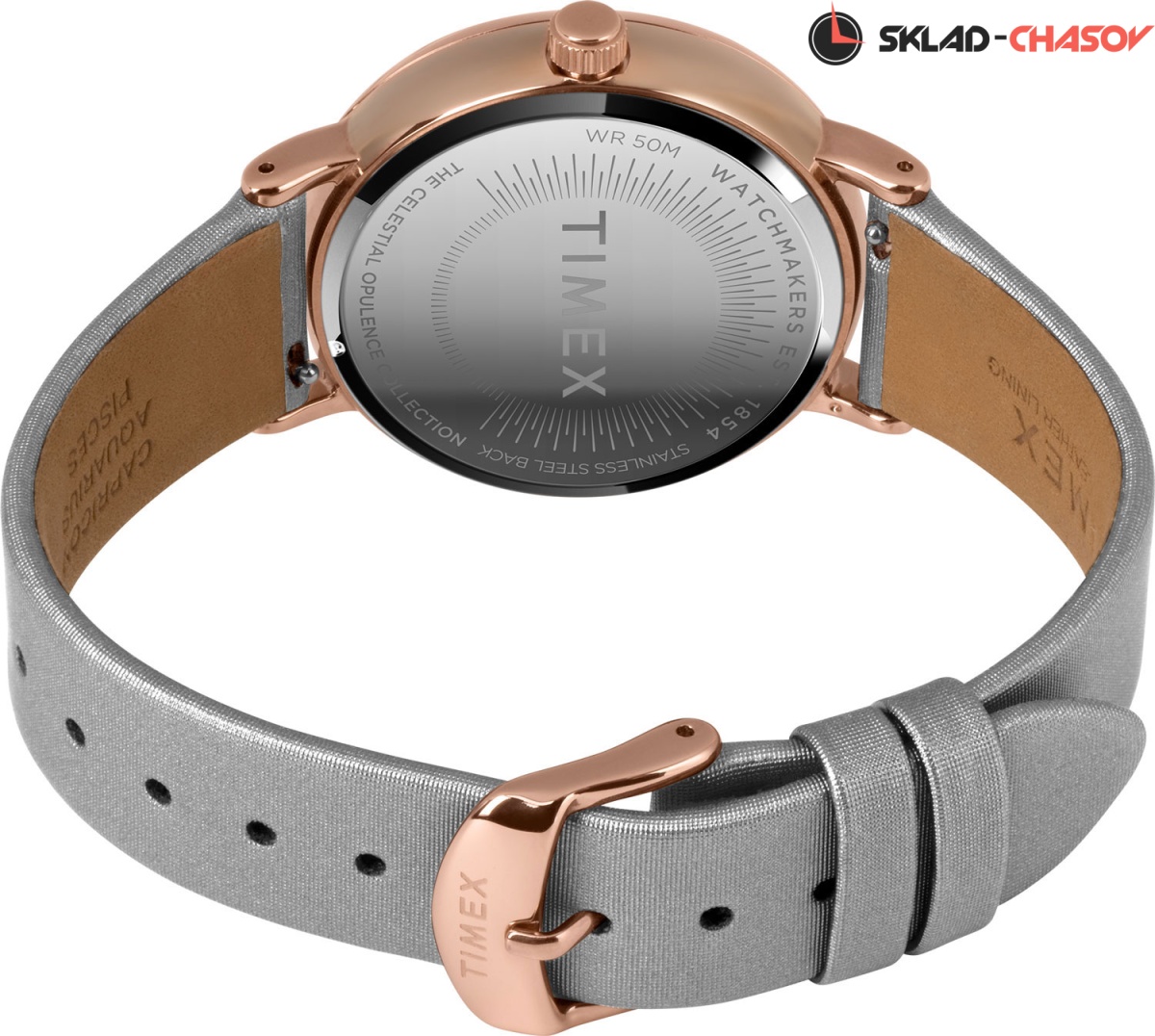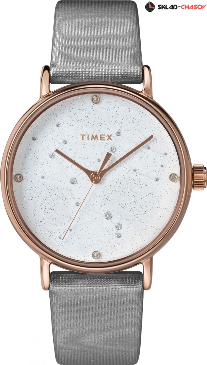 Стильное и интересное дизайнерское решение от Timex. Расставь яркие акценты в образе. Celestial Opulence. Циферблат декорированный знаками зодиака Овен, Телец и Близнецы с мерцающими кристаллами Swarovski. Подсветка Indiglo освещает созвездия, позволяя увидеть звезды в совершенно новом свете. Рифленая заводная головка. Круглый корпус. Кожаный ремешок с классической застежкой.