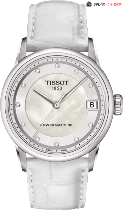 Диаметр: 33 мм. Механизм с автоподзаводом (Powermatic 80). Индикация даты. Перламутровый циферблат декорирован 11 бриллиантами. Прозрачная задняя крышка. Кожаный ремешок с застежкой «бабочка». Международная гарантия 2 года
