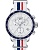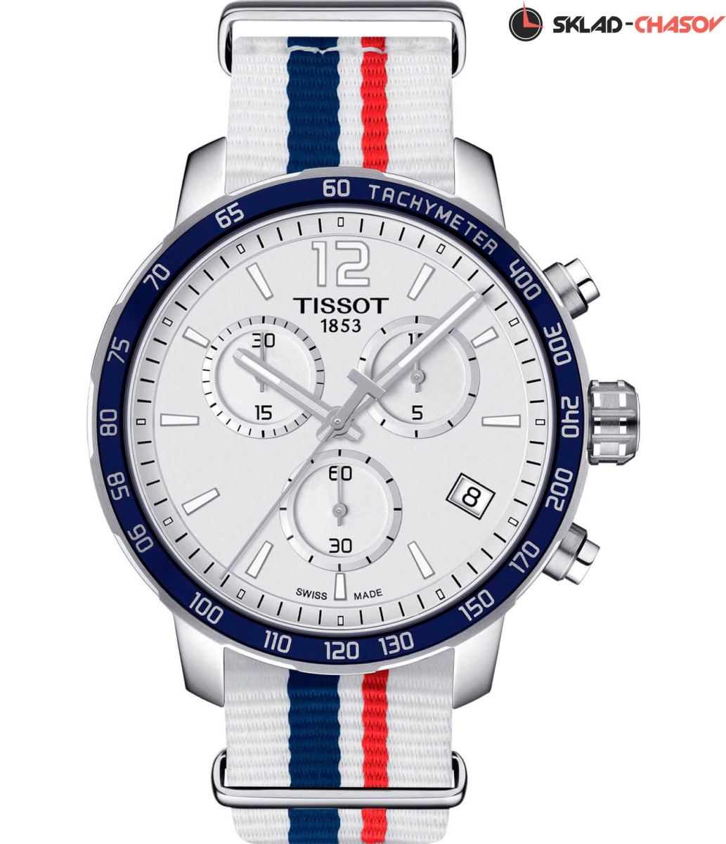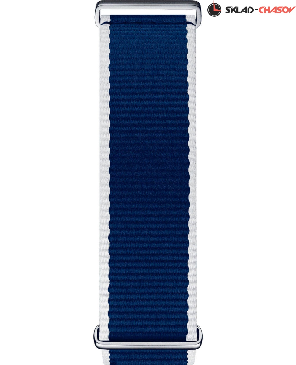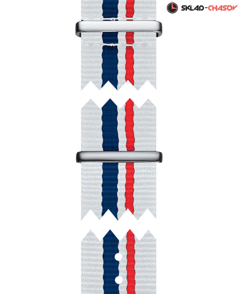 Белый циферблат идеально сочетается с ярким безелем с PVD-покрытием насыщенно-синего цвета. Оригинально выглядит тканевый ремешок NATO белого цвета, украшенный волнами синего и красного оттенка. Такой материал обеспечивает максимальный комфорт при ношении и отличается лёгкостью. Высокая точность хода обеспечивается кварцевым механизмом ETA G10.211. Стекло из сапфира. Класс водозащиты WR 100. Хронограф, секундомер, индикация текущего числа, тахиметр. Габариты: 42 x 42 x 10,7 мм.