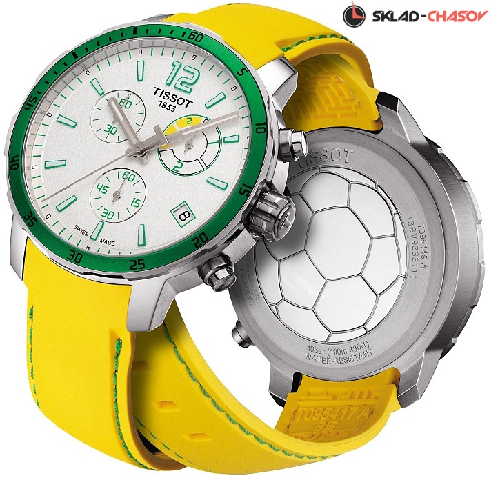 Мужские швейцарские часы Tissot Quickster Chronograph Football T095.449.17.037.01, кварцевый механизм с высокой точностью. Сапфировое стекло устойчивое к появлению царапин, обладающее высокой прозрачностью. Класс водозащиты: 100 метров, позволит плавать, нырять и заниматься другими водными видами спорта. Корпус часов изготовлен из стали, серебристого цвета.