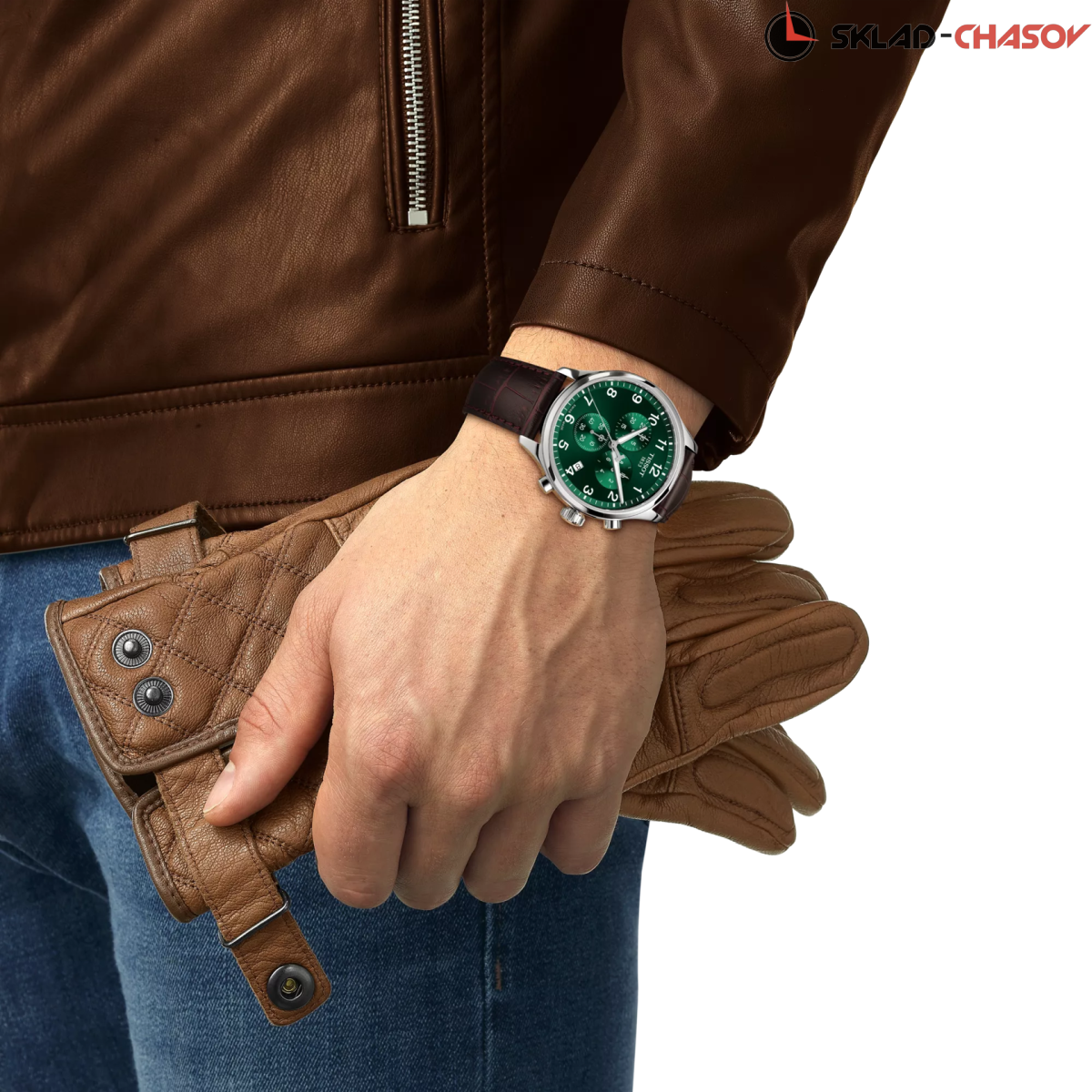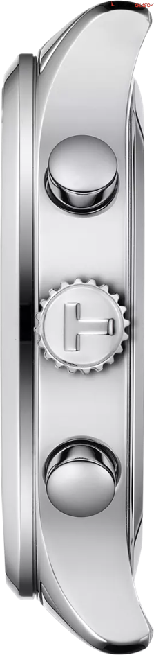 Мужской хронограф. Окошко даты в положении 4 часа, малая секунда в положении 6 часов, 30-минутный счетчик на 10 часов и счетчик 1\10 секунды на 2 часа.