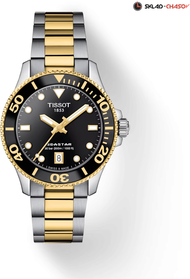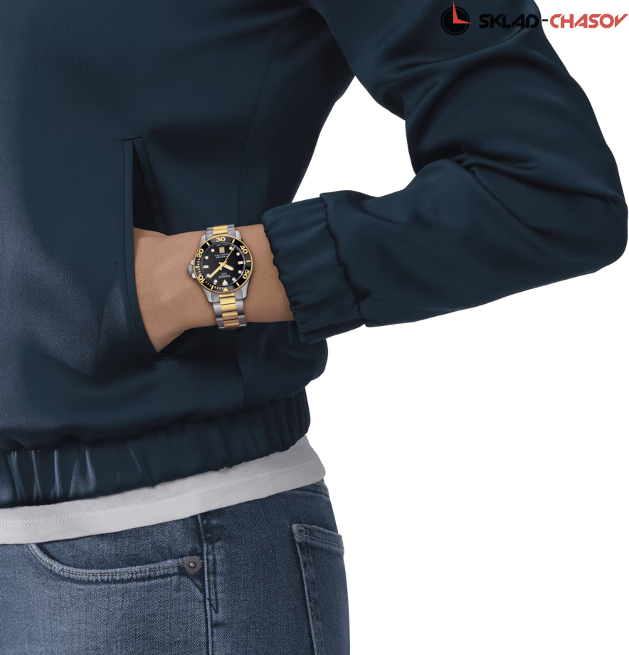 Женская модель для поклонников водных видов спорта. Однонаправленно вращающийся безель с минутной шкалой, окошко даты в положении 6 часов, люминесцентное покрытие на разметке и стрелках.