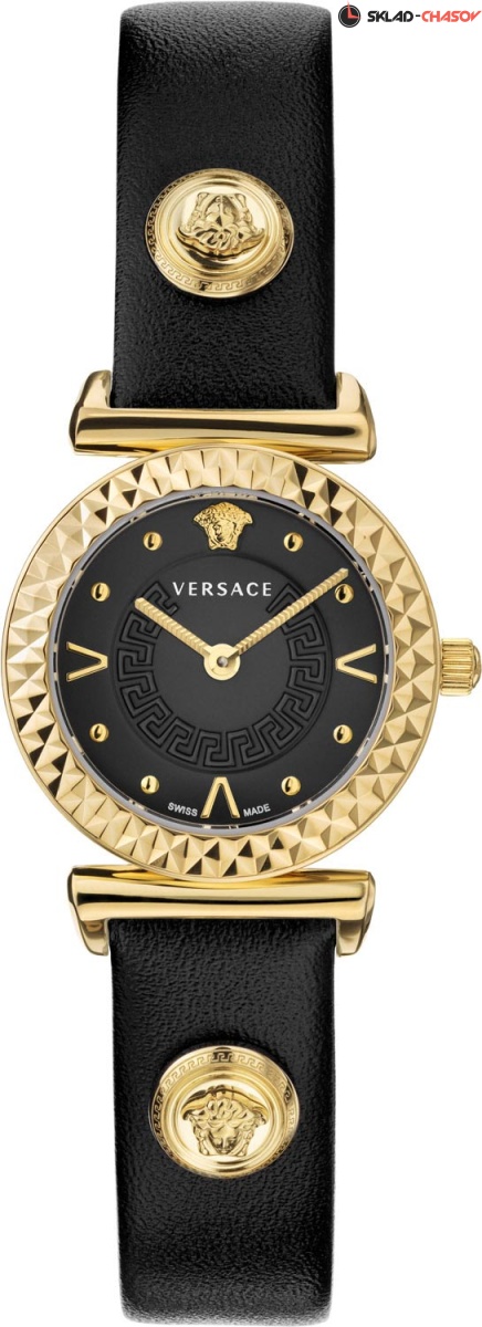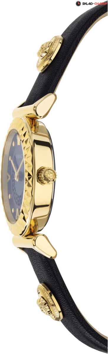 Неповторимый стиль и множество имиджевых мелочей подчеркнут уникальность вашего модного образа. Дизайнерские женские часы Mini Vanity. Круглый стальной корпус с граненым безелем. Циферблат часов украшен греческим орнаментом Меандром. Золотистая голова Медузы на отметке 12 часов. Метки в виде точек и штрихов с V-образной формой, что придает этим часам индивидуальность, подчеркивая винтажный стиль. Рифленая заводная головка украшена рельефным изображением головы Медузы. Задняя крышка украшена гравировкой головой Медузы. Кожаный ремешок с двумя заклепками в виде головы Медузы, оснащен раскладывающейся застежкой.