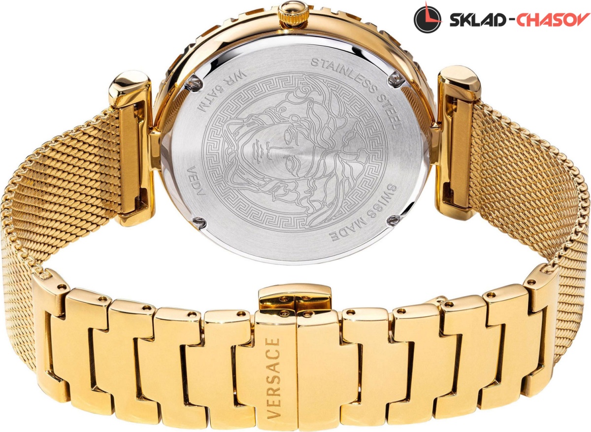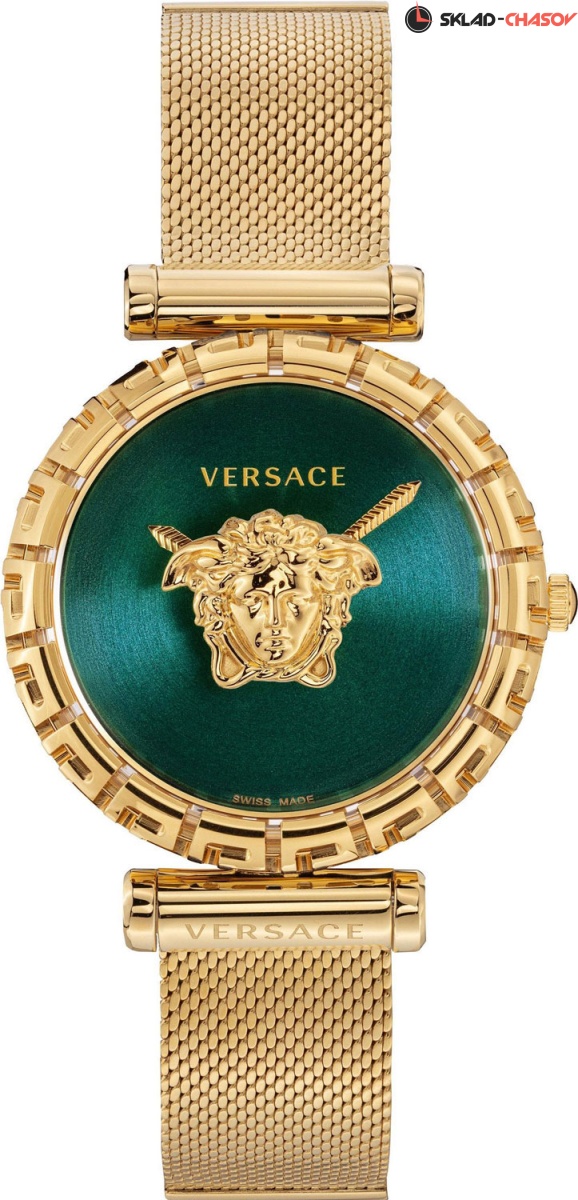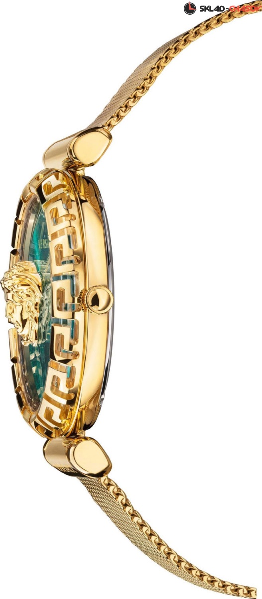 Изысканный стиль, очарование и элегантный дизайн - привлекательное сочетание для стильной и современной леди. Palazzo Empire Greca. По центру циферблата расположена золотистая голова Медузы. Безель выполнен в виде объемного меандрового орнамента. Браслет миланского плетения.