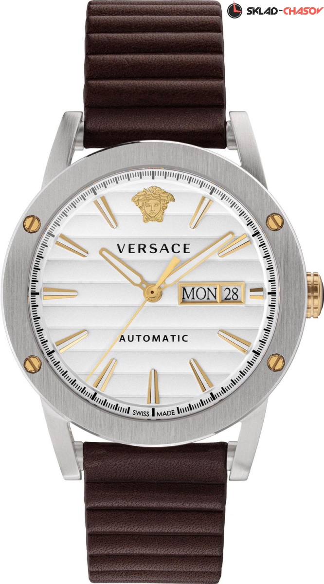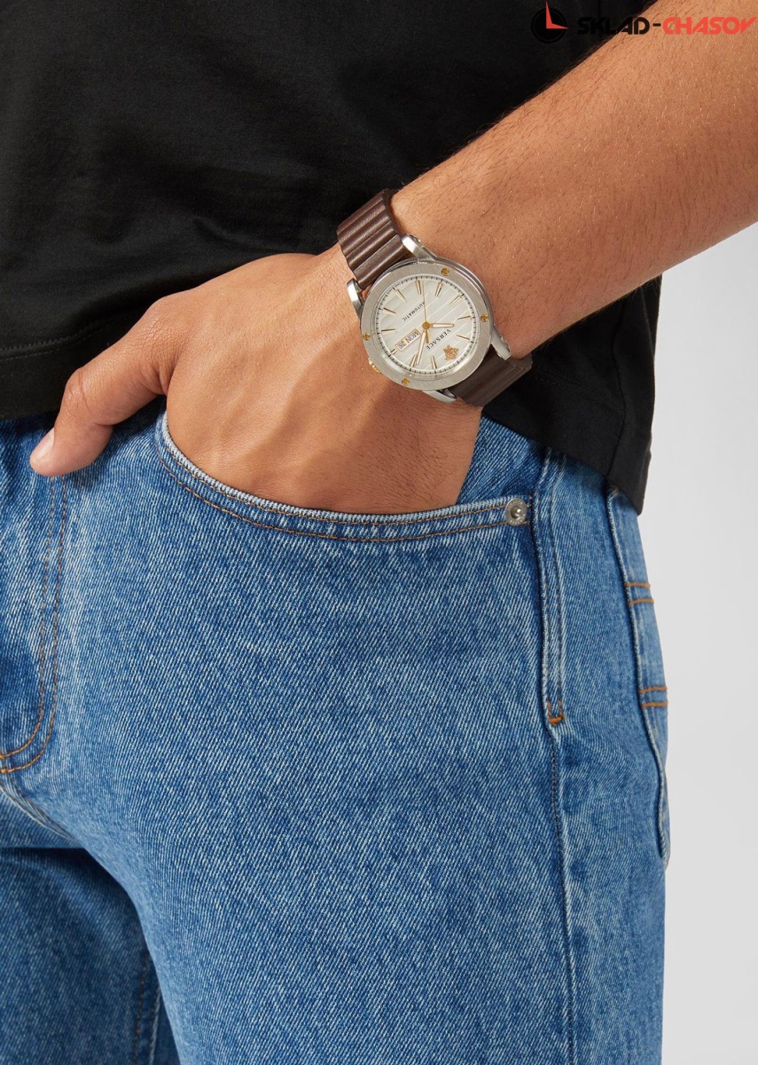 Часы для стильных мужчин, которые любят быть в центре внимания. Их представительский внешний вид заставит окружающих признать ваше превосходство. Theros. Циферблат с метками в виде штрихов. Метка на 12 часов выполнена в виде головы Медузы. Окошко даты и дня недели. Рифленая заводная головка. Круглый корпус. Прозрачная задняя крышка крепится на винтах. Ремешок из натуральной кожи с тройной раскладывающейся застежкой.