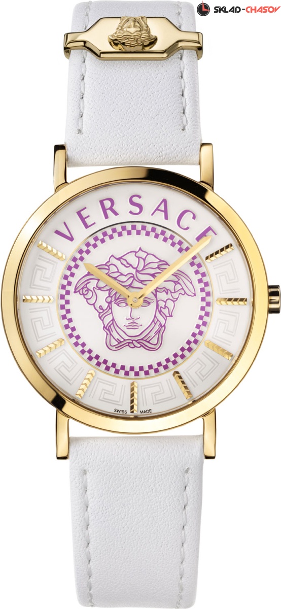 Модные женские часы с выразительным логотипом, которые подчеркнут вашу индивидуальность и умение выбирать роскошные аксессуары. V-Essential. Круглый стальной полированный корпус. Циферблат украшен объемным фирменным логотипом в виде головы Медузы, фрагментированным меандровым орнаментом Greca между часовых меток и изогнутой надписью ''Versace'' в положении 12 часов. Метки в виде штрихов. Гладкая заводная головка. Удобный кожаный ремешок с классической застежкой. Задняя крышка и декоративная вставка на ремешке украшены логотипом в виде головы Медузы.