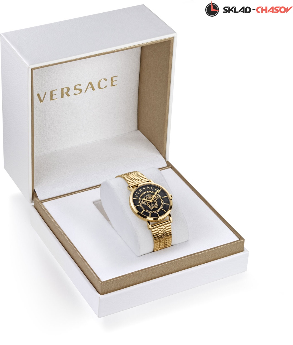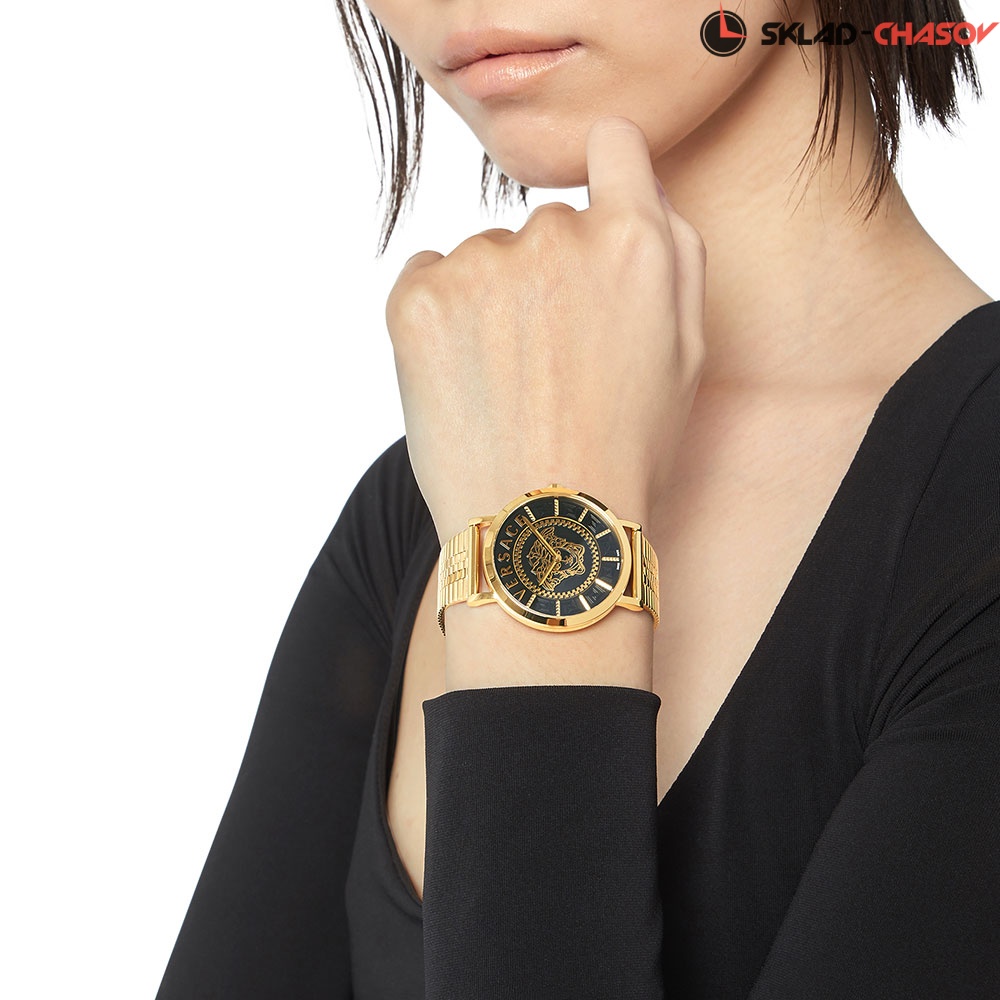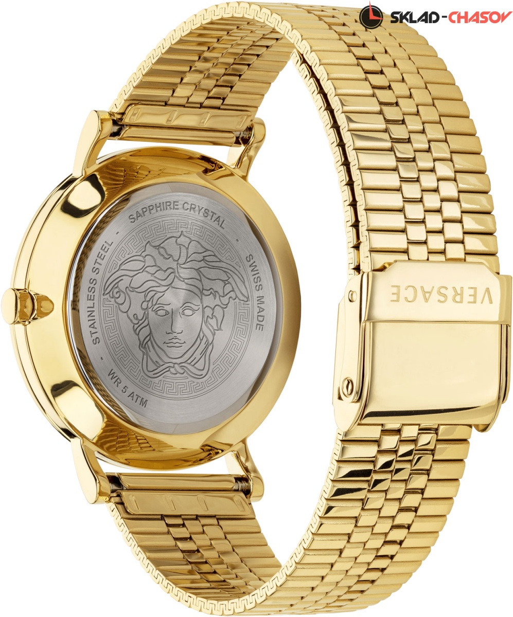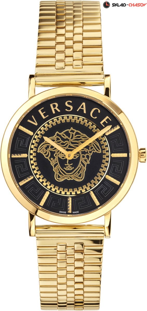 Модные женские часы с выразительным логотипом, которые подчеркнут вашу индивидуальность и умение выбирать роскошные аксессуары. V-Essential. Круглый стальной полированный корпус. Циферблат украшен объемным фирменным логотипом в виде головы Медузы, фрагментированным меандровым орнаментом Greca между часовых меток и изогнутой надписью ''Versace'' в положении 12 часов. Метки в виде штрихов. Гладкая заводная головка. Задняя крышка украшена выгравированным логотипом в виде головы Медузы, окруженной меандровым орнаментом Greca. Стальной браслет с застежкой - раскладным замком. Застежка с системой блокировки.